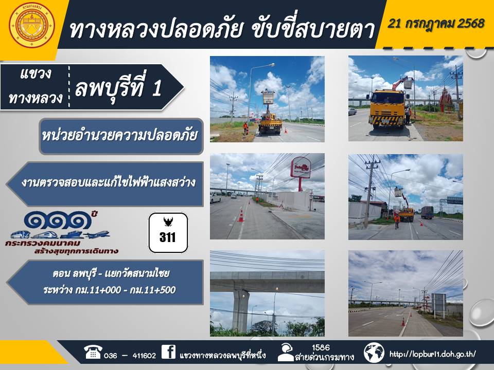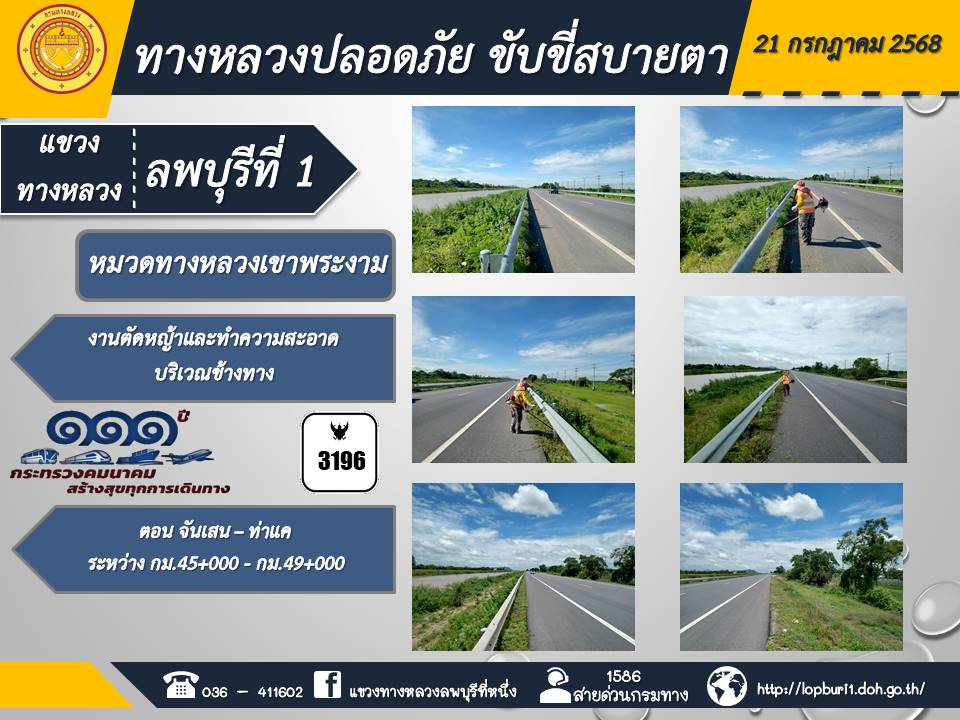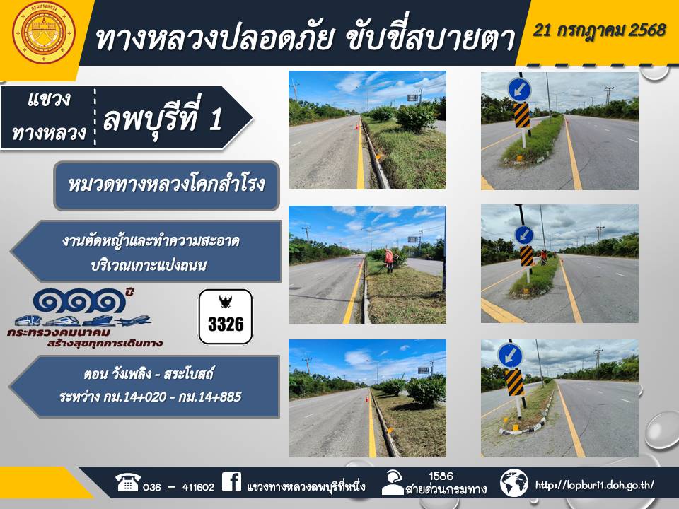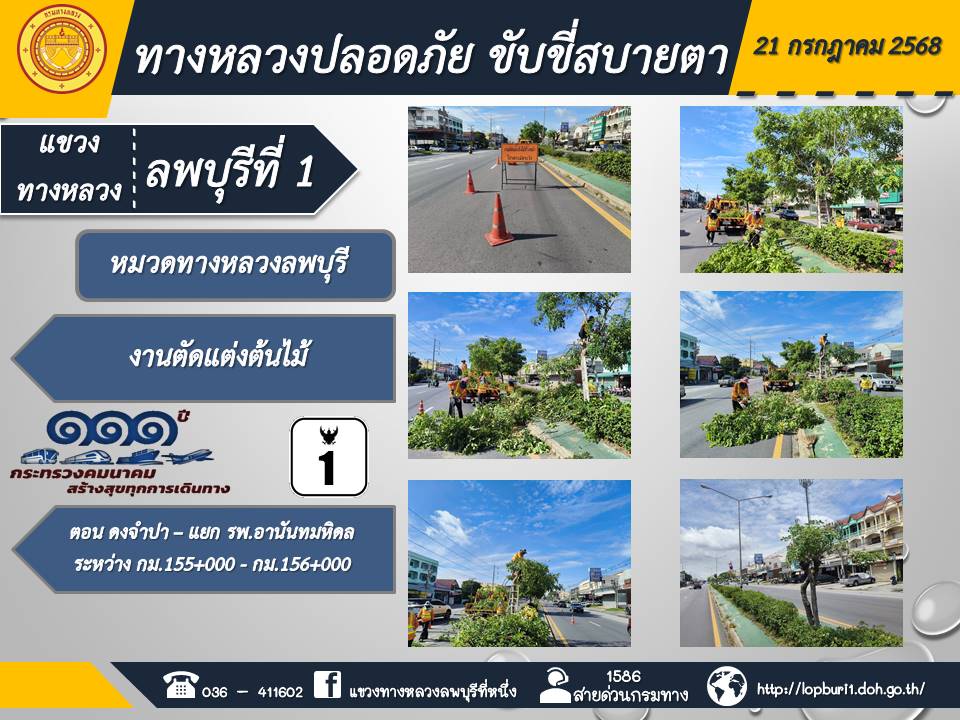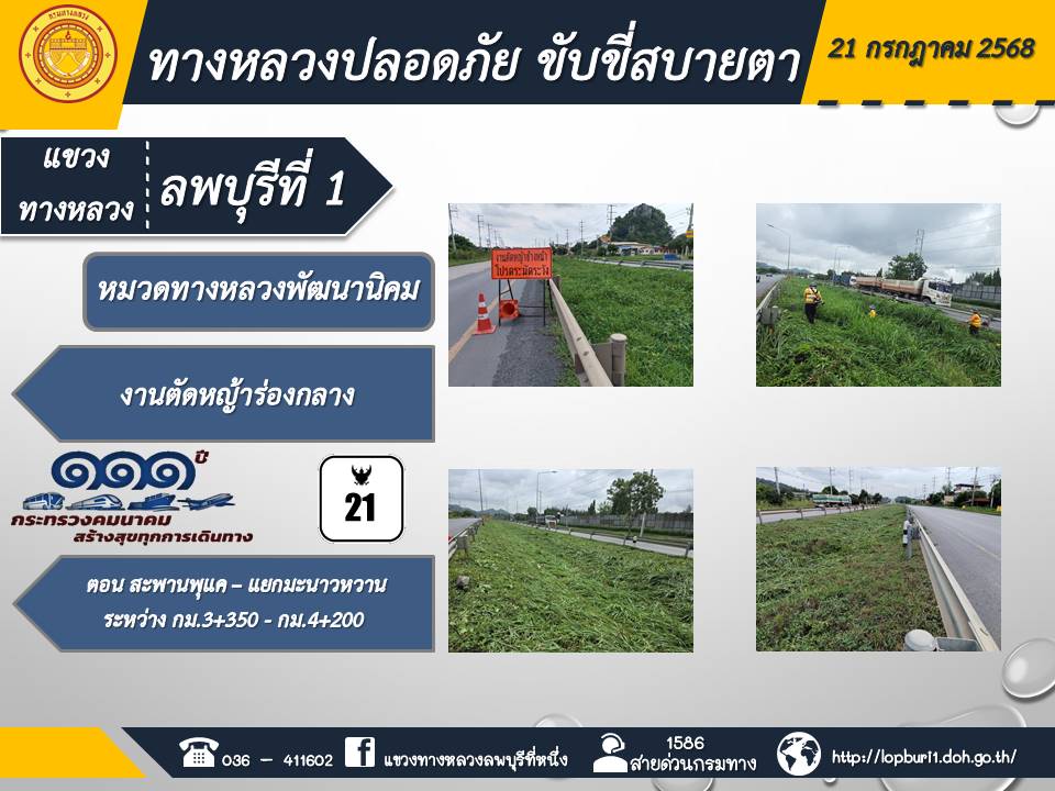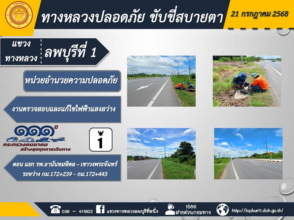 ทางหลวงปลอดภัยขับขี่สบายตา แขวงทางหลวงลพบุรีที่ 1 ประจำวันที่ 21 กรกฎาคม 2568