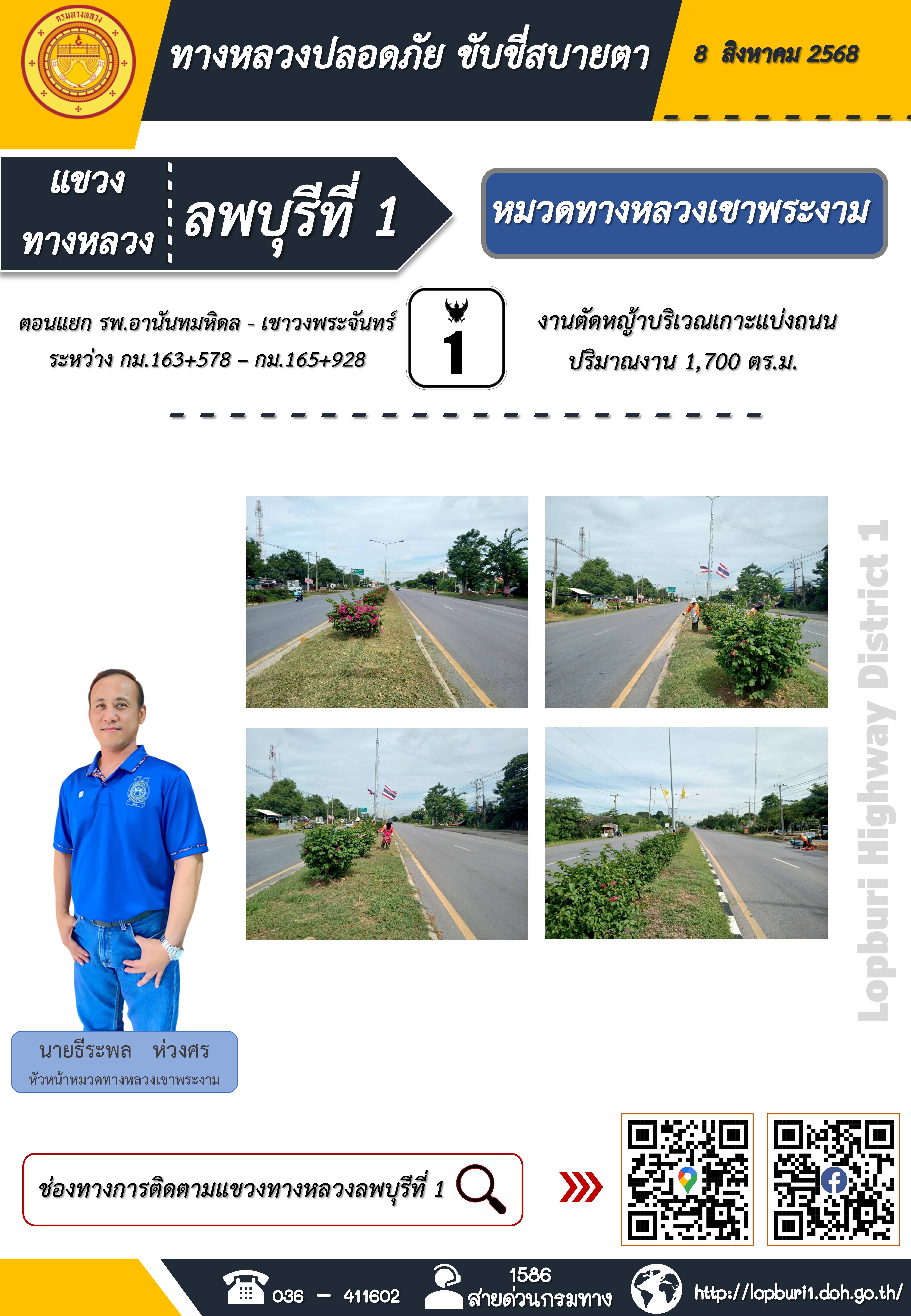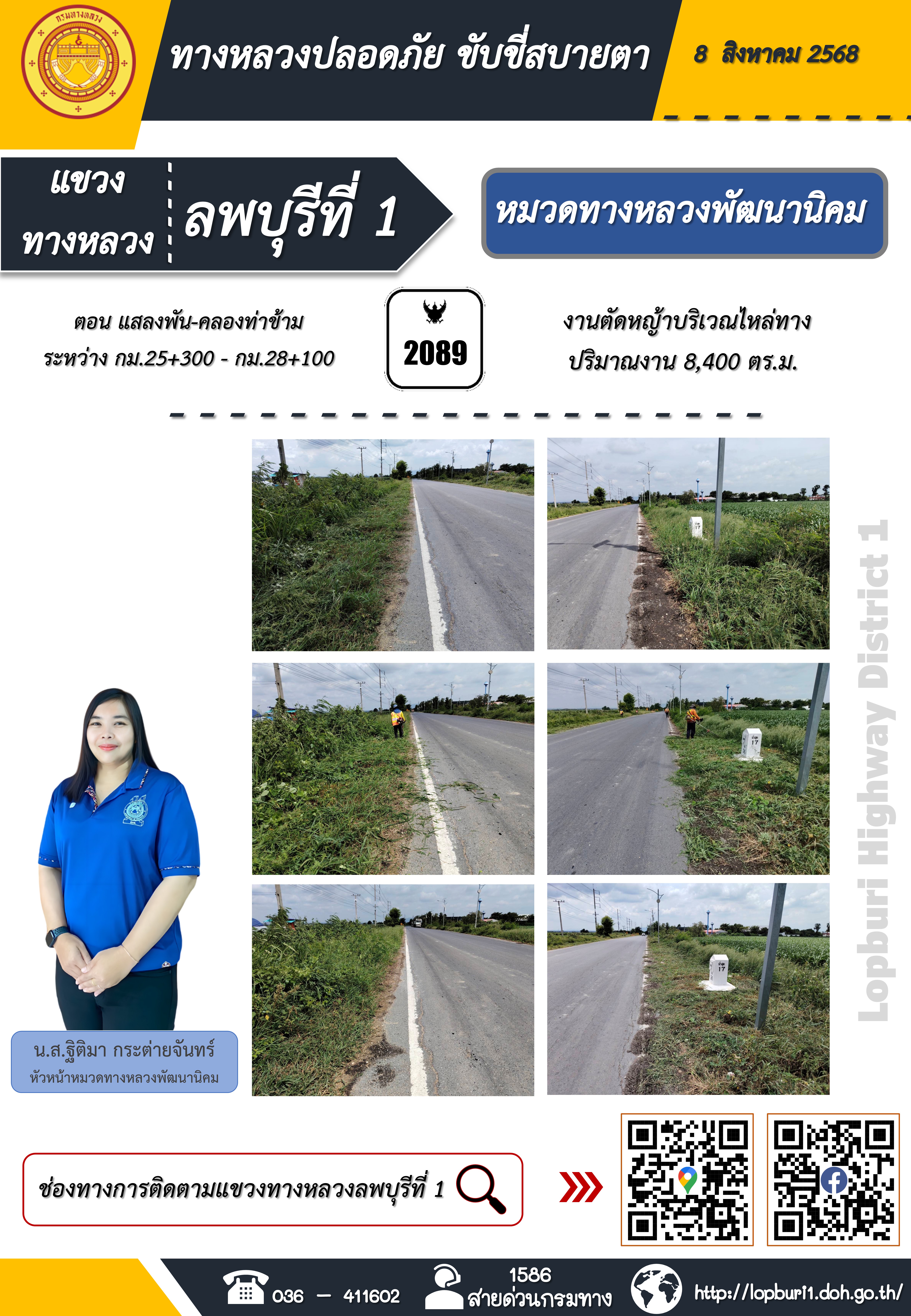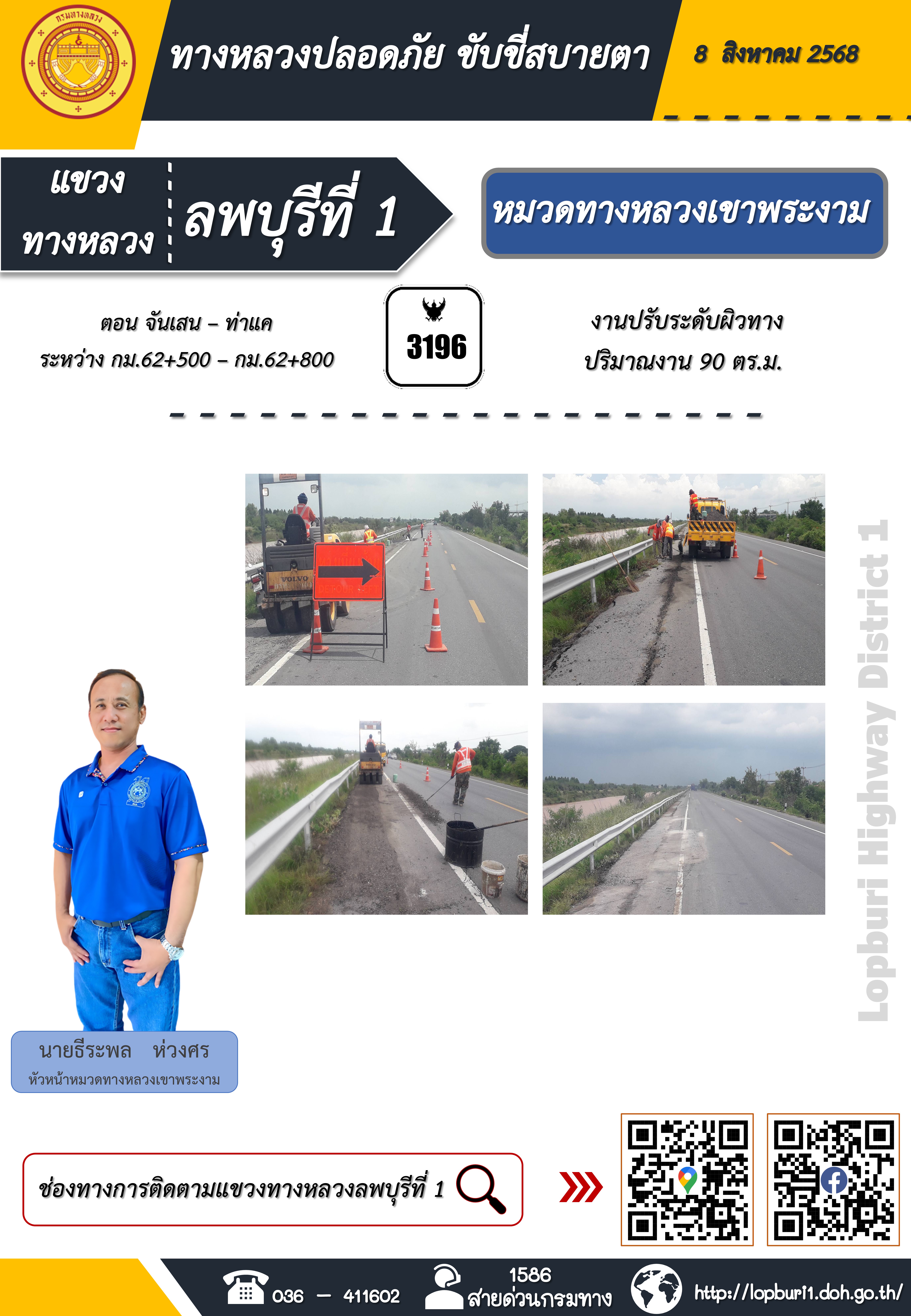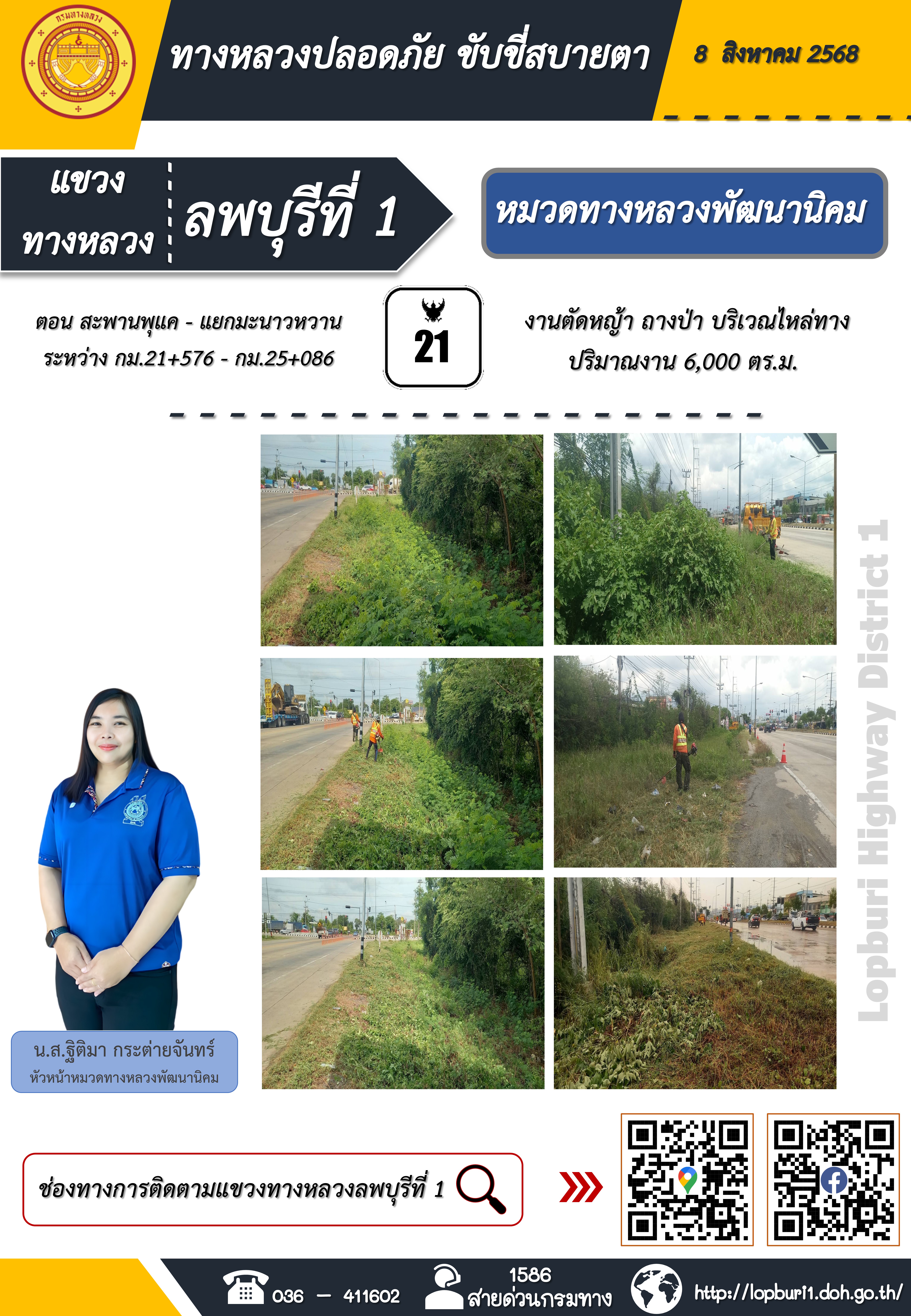 ทางหลวงปลอดภัยขับขี่สบายตา แขวงทางหลวงลพบุรีที่ 1 ประจำวันที่ 8 สิงหาคม 2568