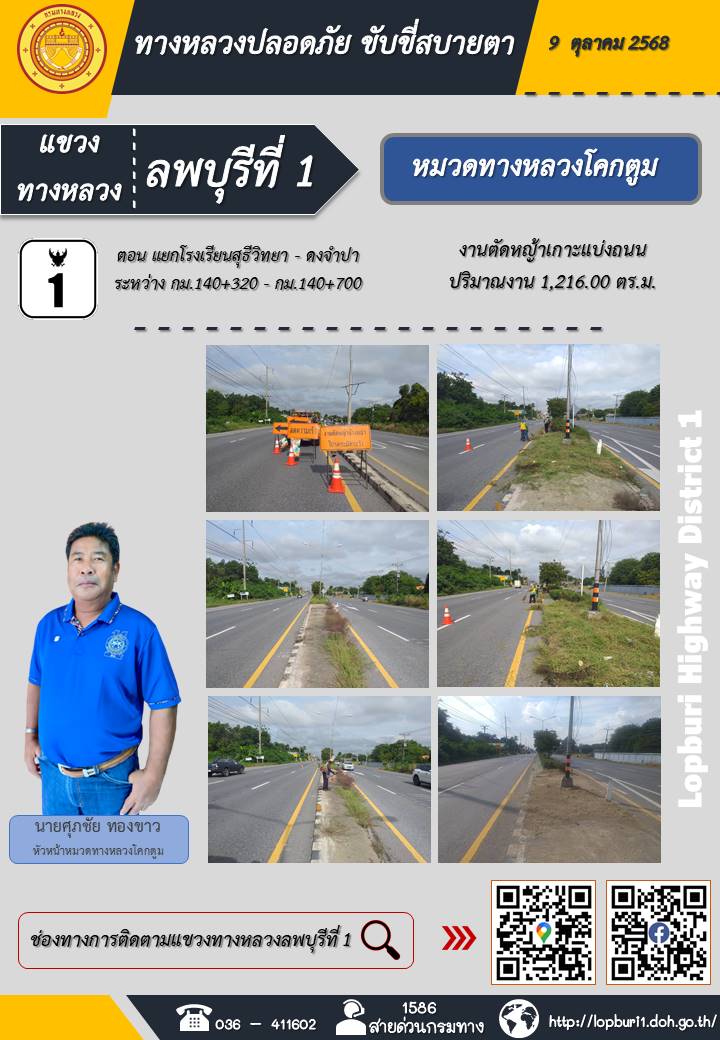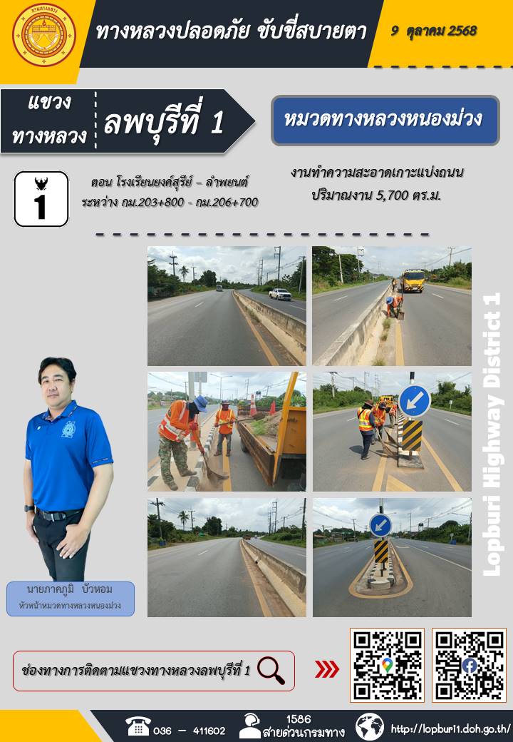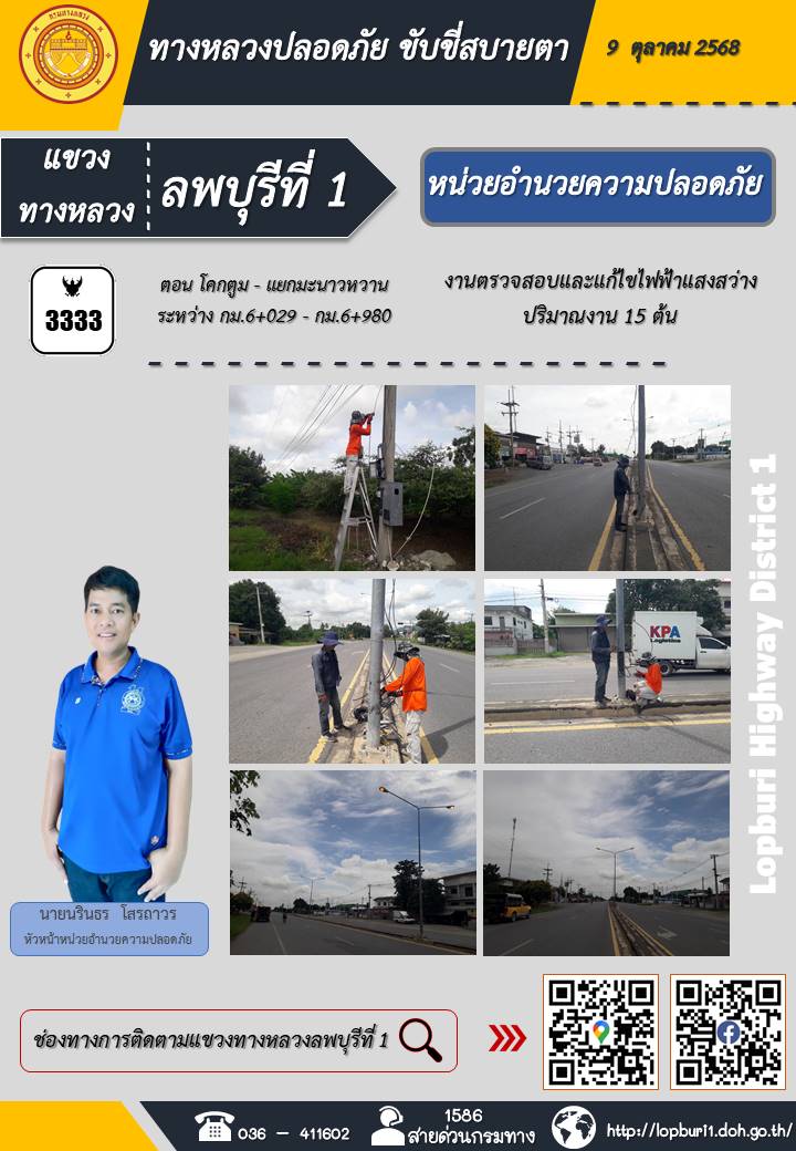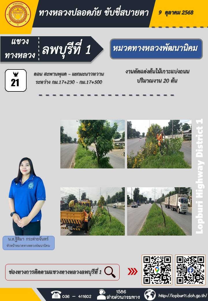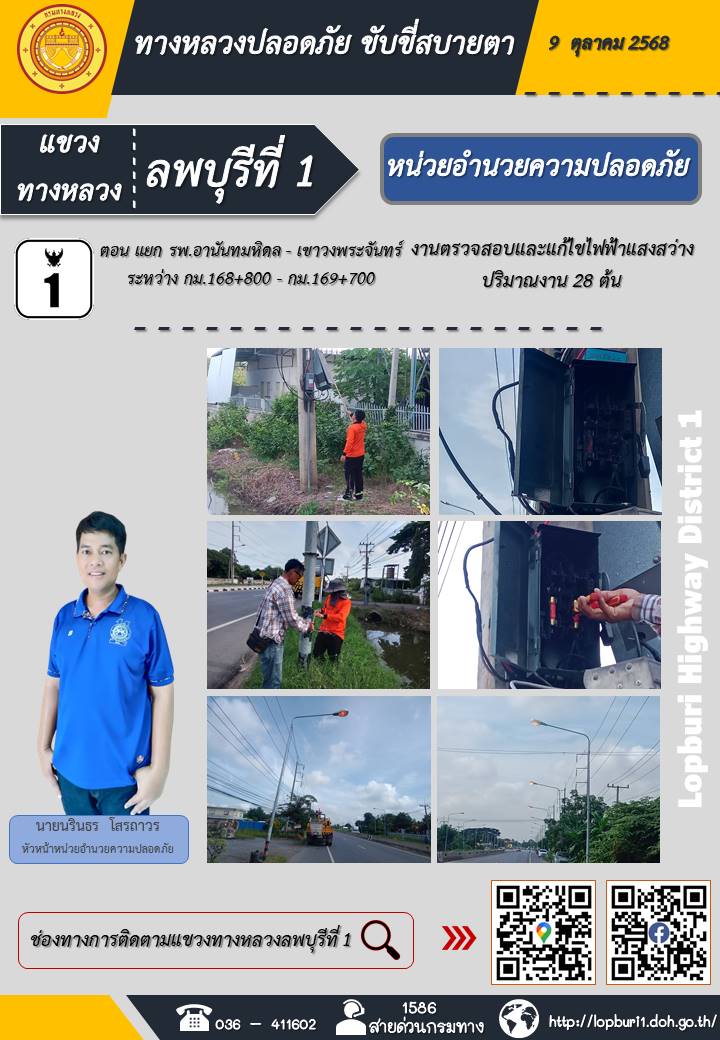 ทางหลวงปลอดภัยขับขี่สบายตา แขวงทางหลวงลพบุรีที่ 1 ประจำวันที่ 9 ตุลาคม 2568