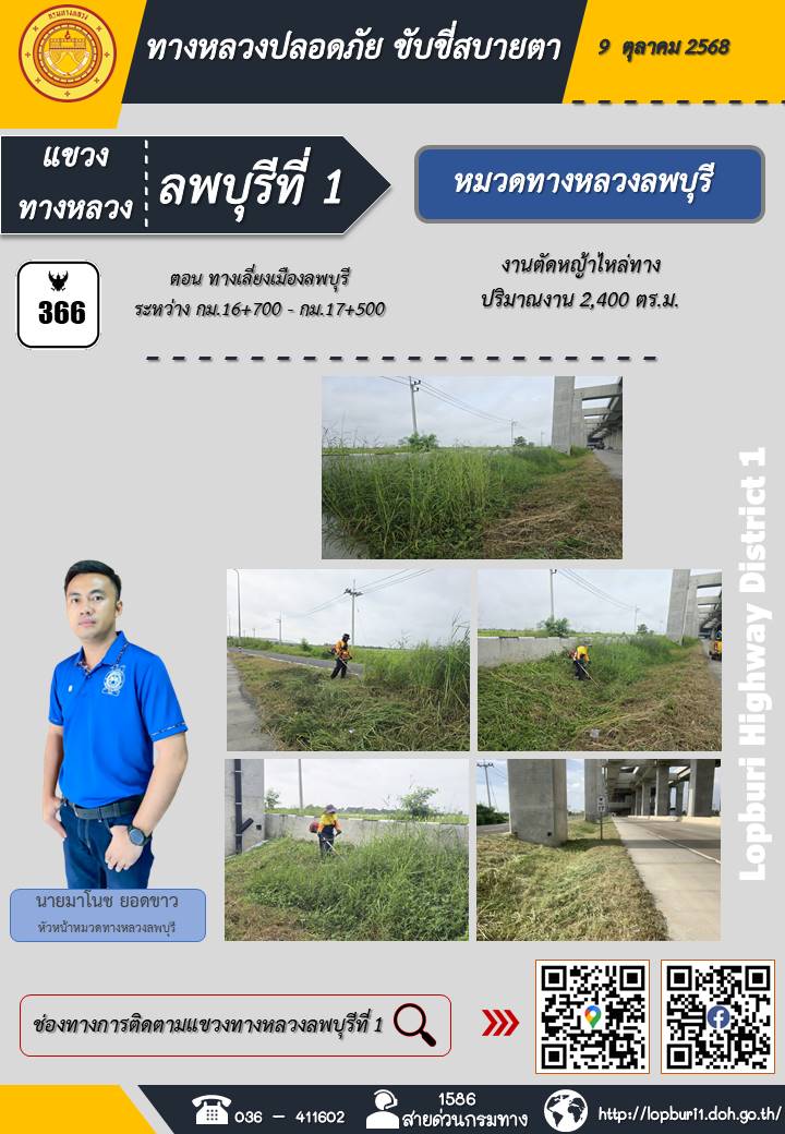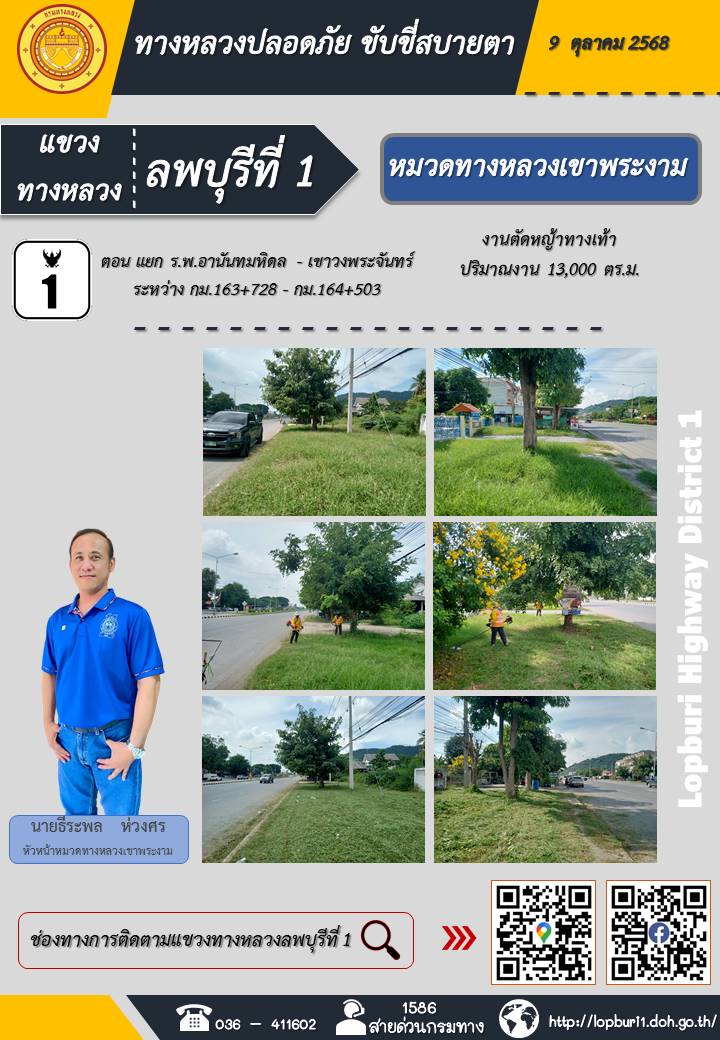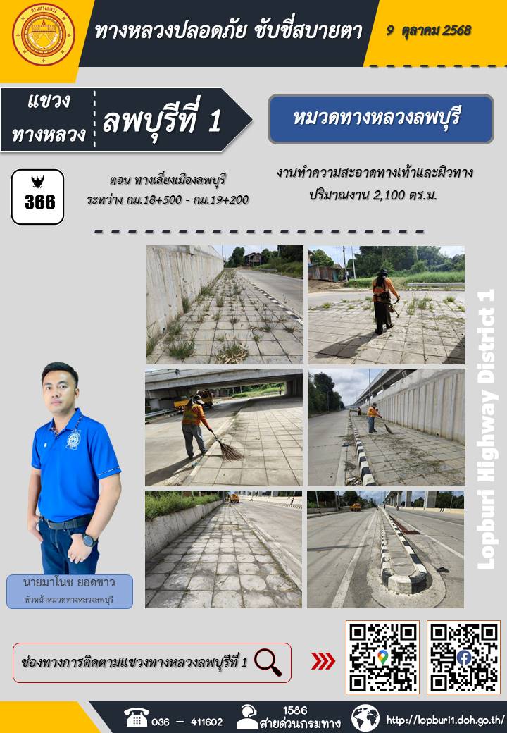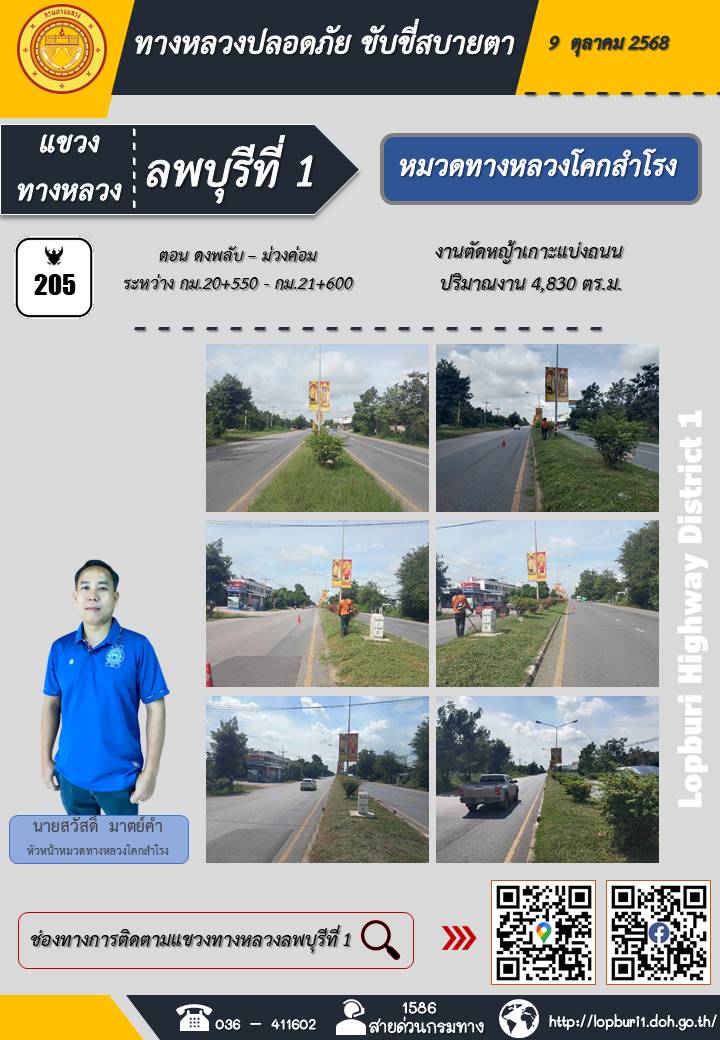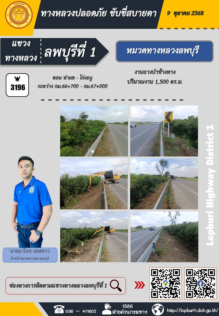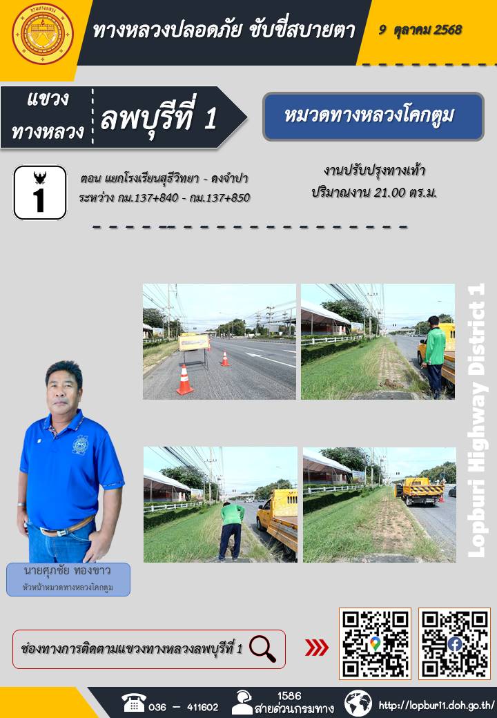 ทางหลวงปลอดภัยขับขี่สบายตา แขวงทางหลวงลพบุรีที่ 1 ประจำวันที่ 9 ตุลาคม 2568