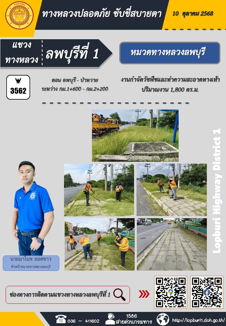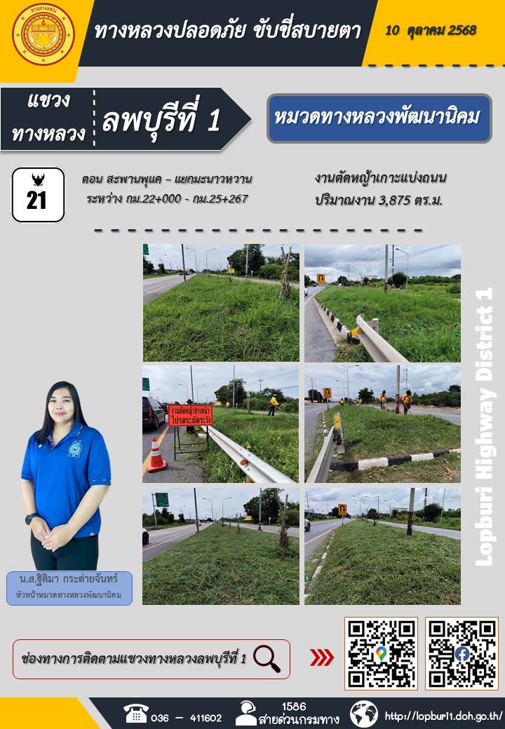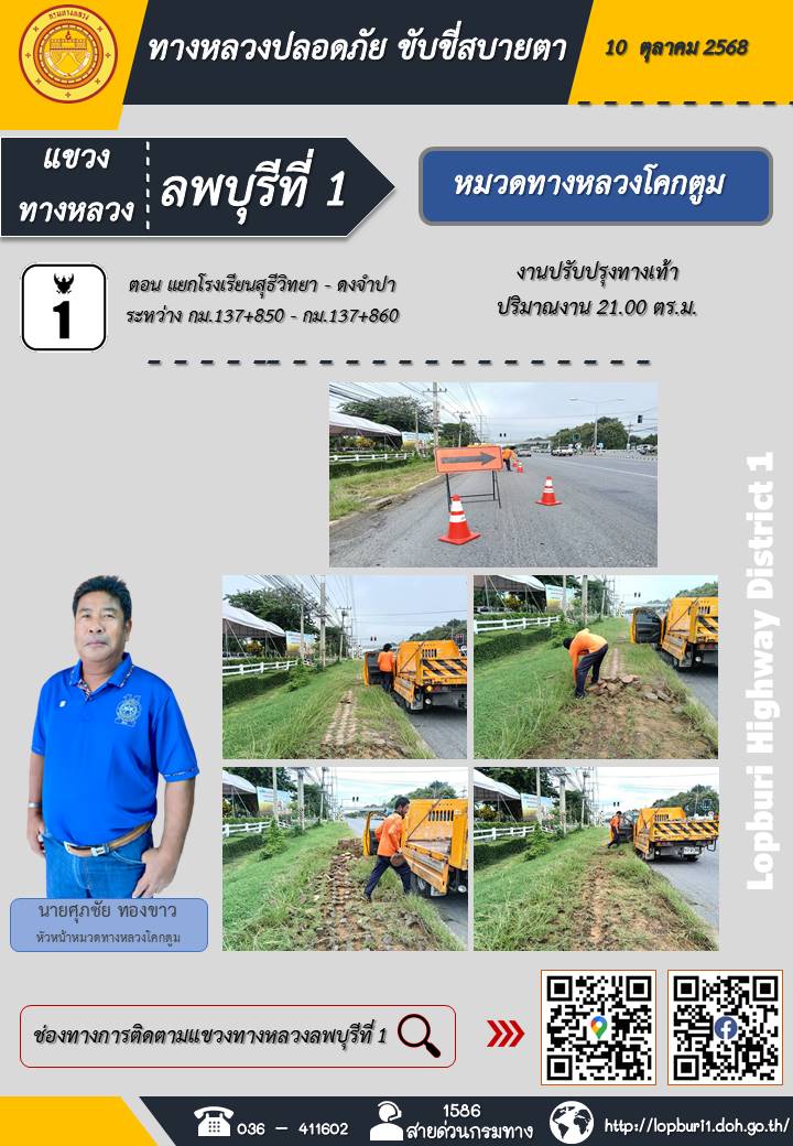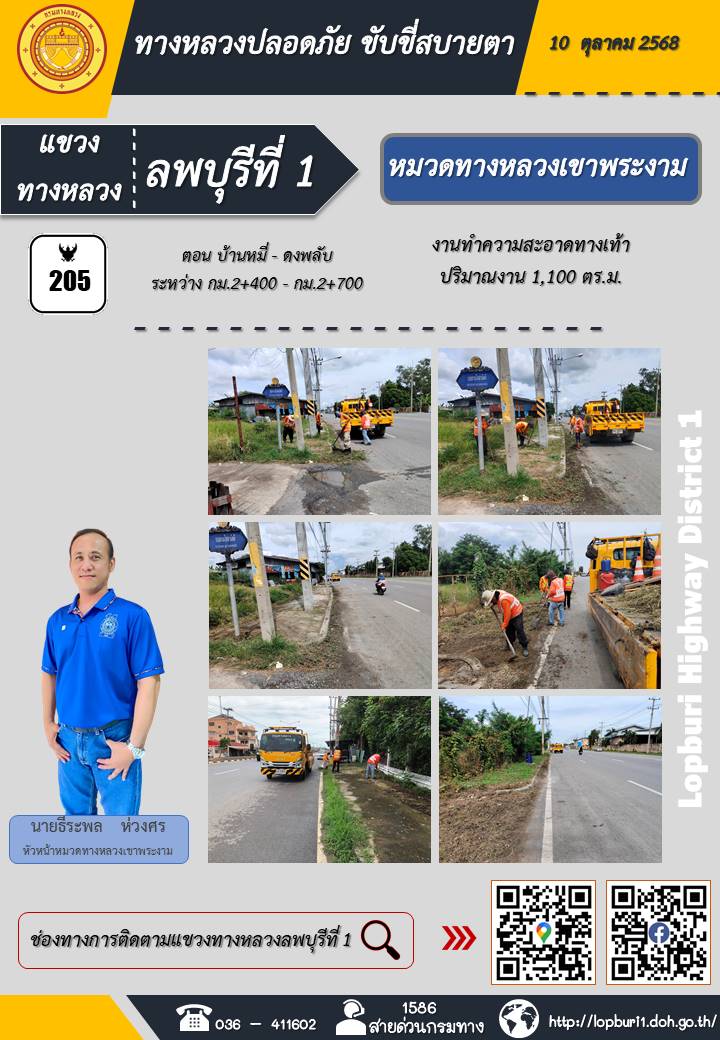 ทางหลวงปลอดภัยขับขี่สบายตา แขวงทางหลวงลพบุรีที่ 1 ประจำวันที่ 10 ตุลาคม 2568