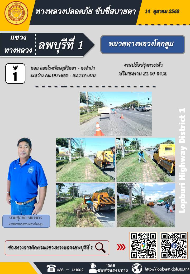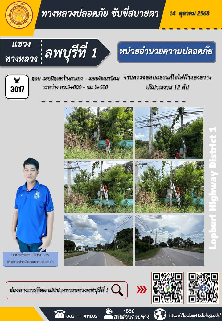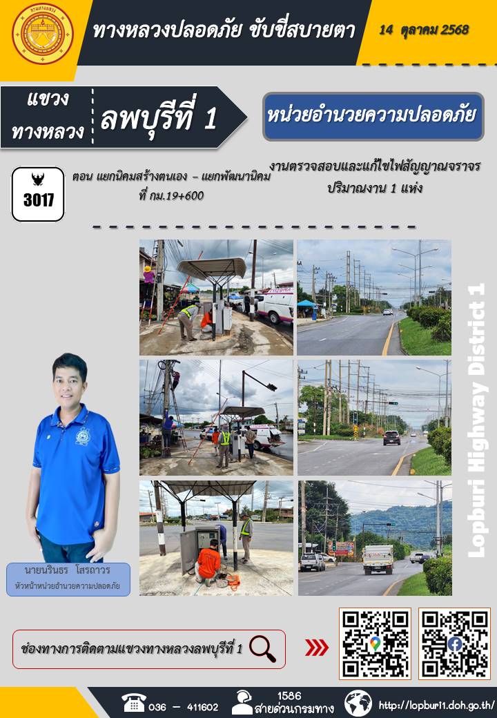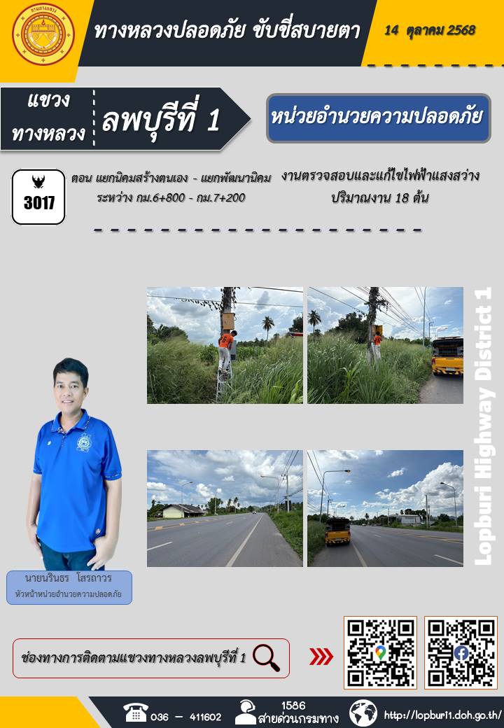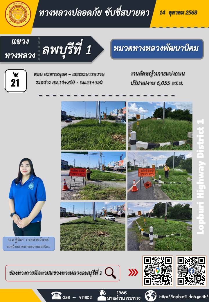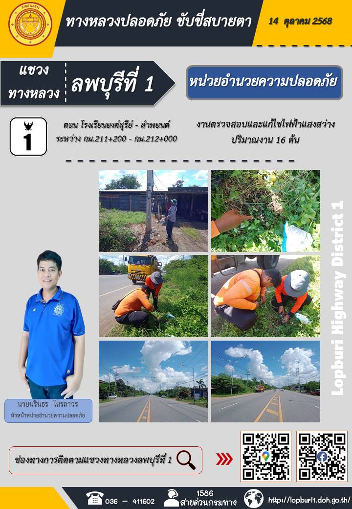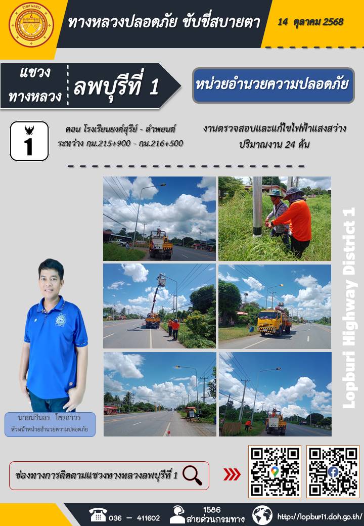 ทางหลวงปลอดภัยขับขี่สบายตา แขวงทางหลวงลพบุรีที่ 1 ประจำวันที่ 14 ตุลาคม 2568