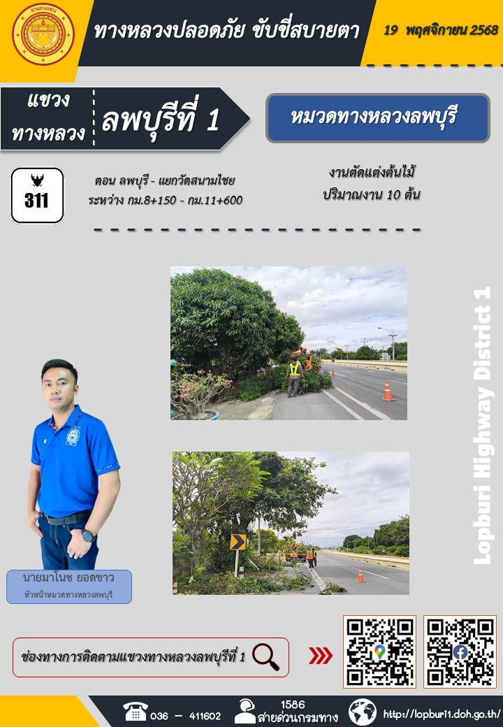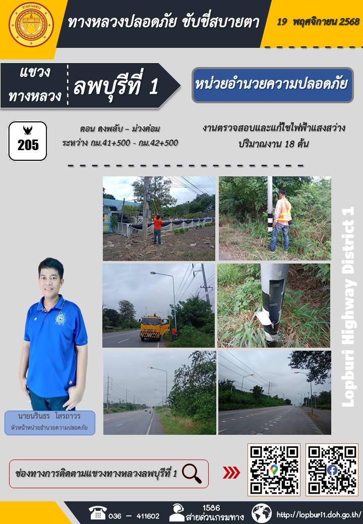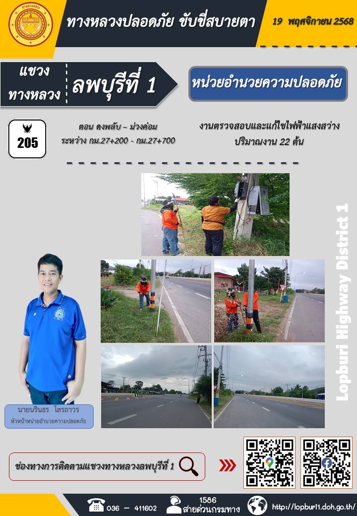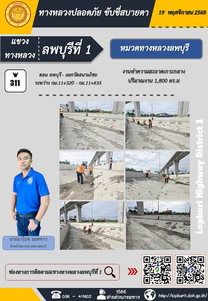 ทางหลวงปลอดภัยขับขี่สบายตา แขวงทางหลวงลพบุรีที่ 1 ประจำวันที่ 19 พฤศจิกายน 2568