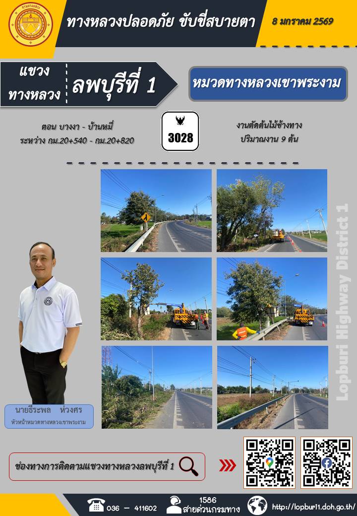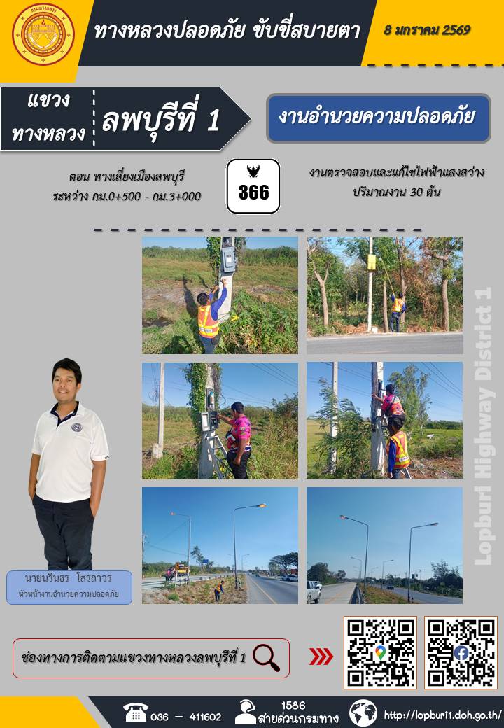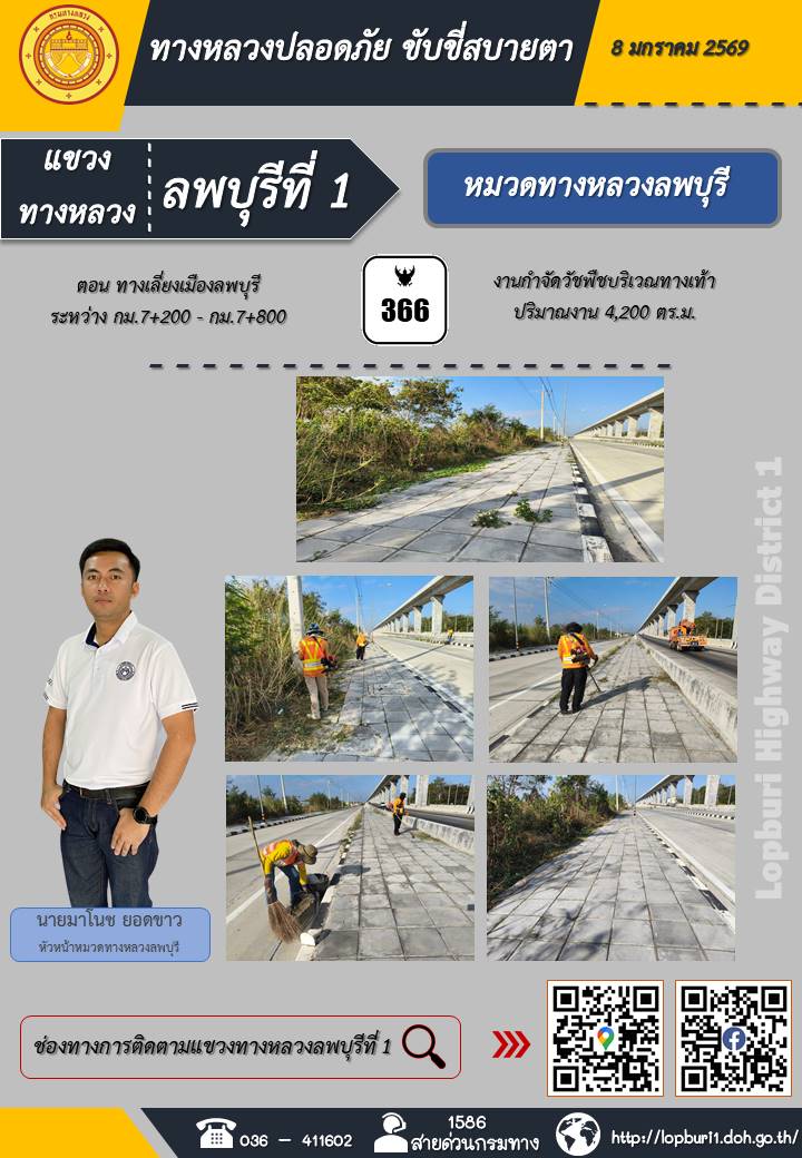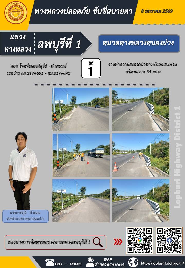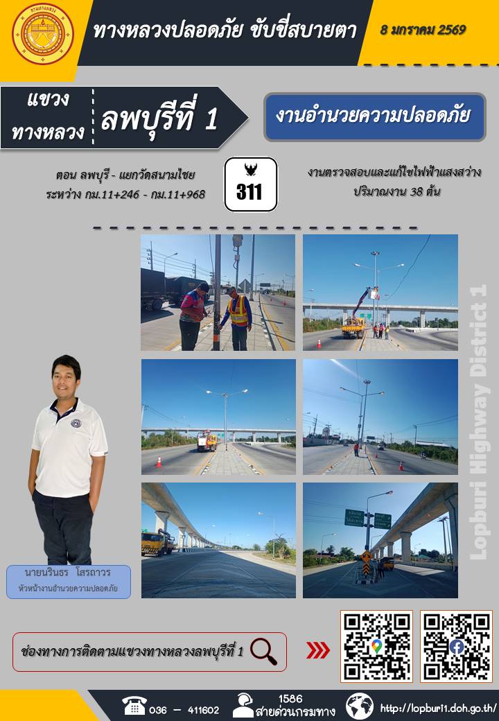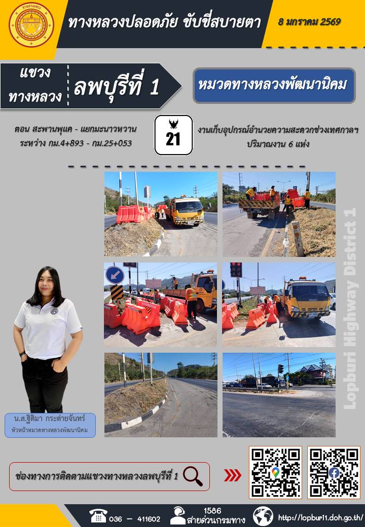 ทางหลวงปลอดภัยขับขี่สบายตา แขวงทางหลวงลพบุรีที่ 1 ประจำวันที่ 8 มกราคม 2569