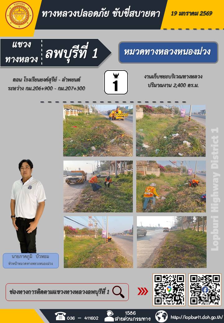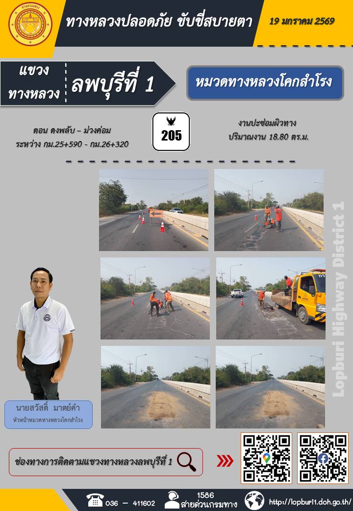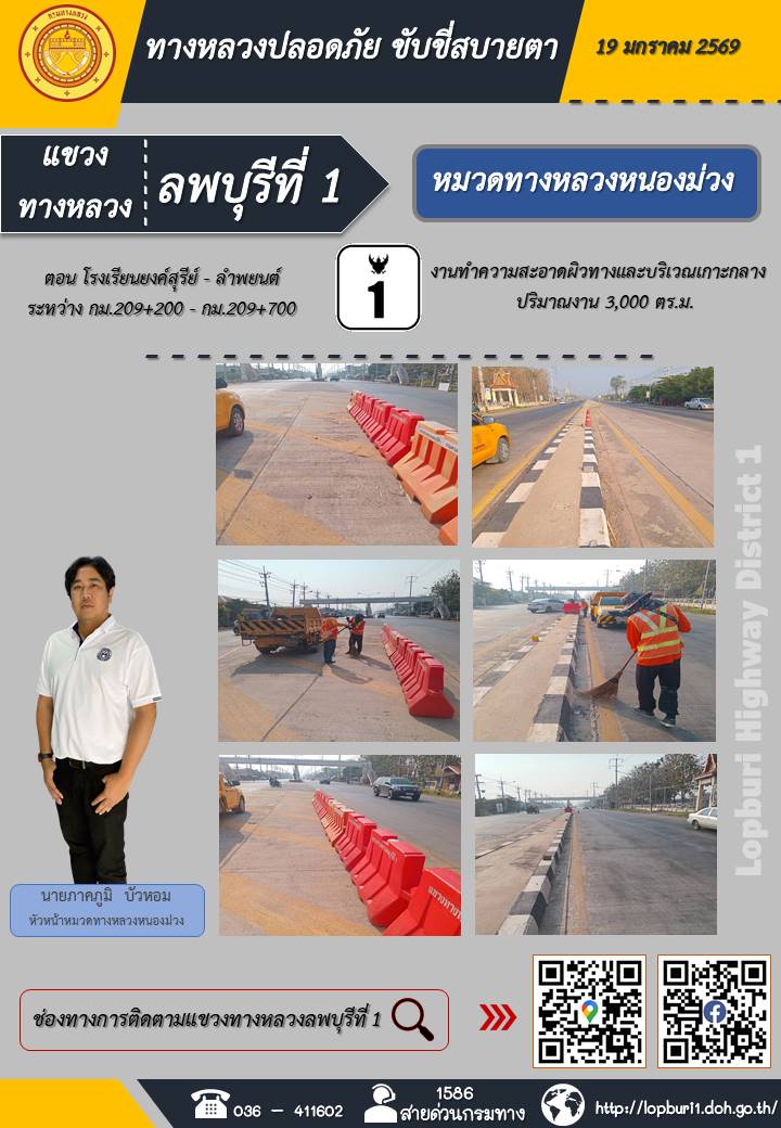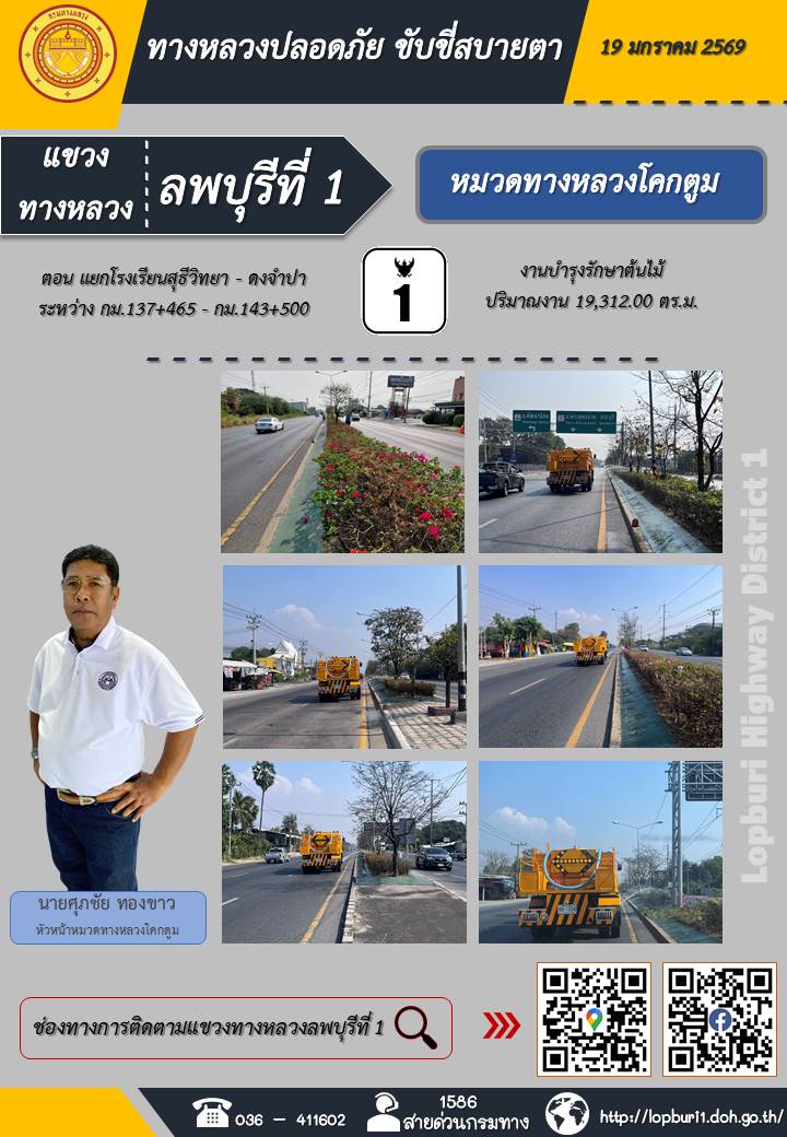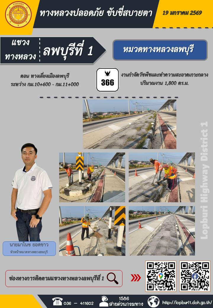 ทางหลวงปลอดภัยขับขี่สบายตา แขวงทางหลวงลพบุรีที่ 1 ประจำวันที่ 19 มกราคม 2569