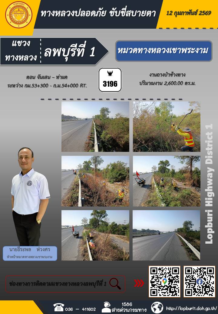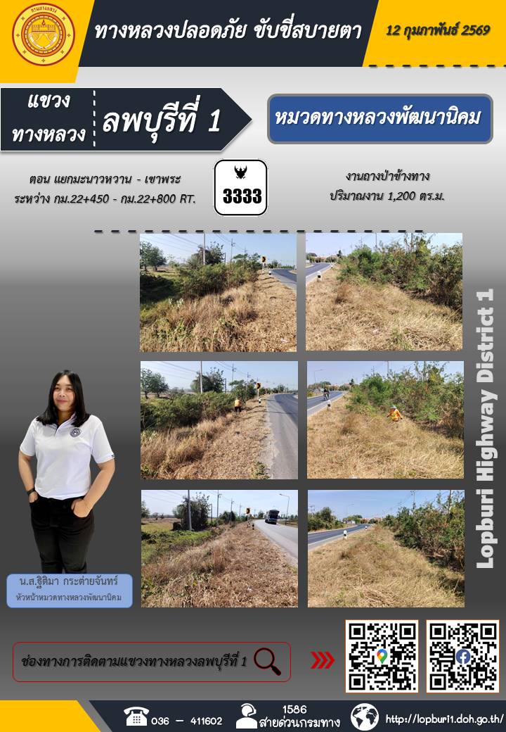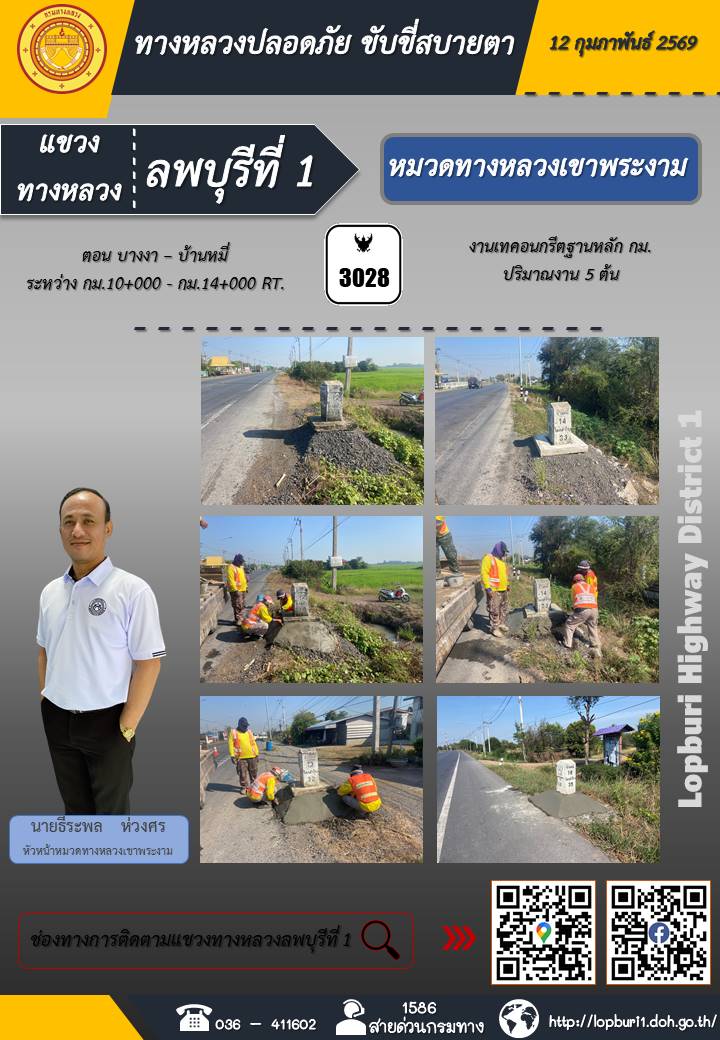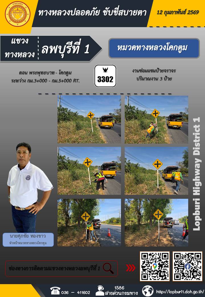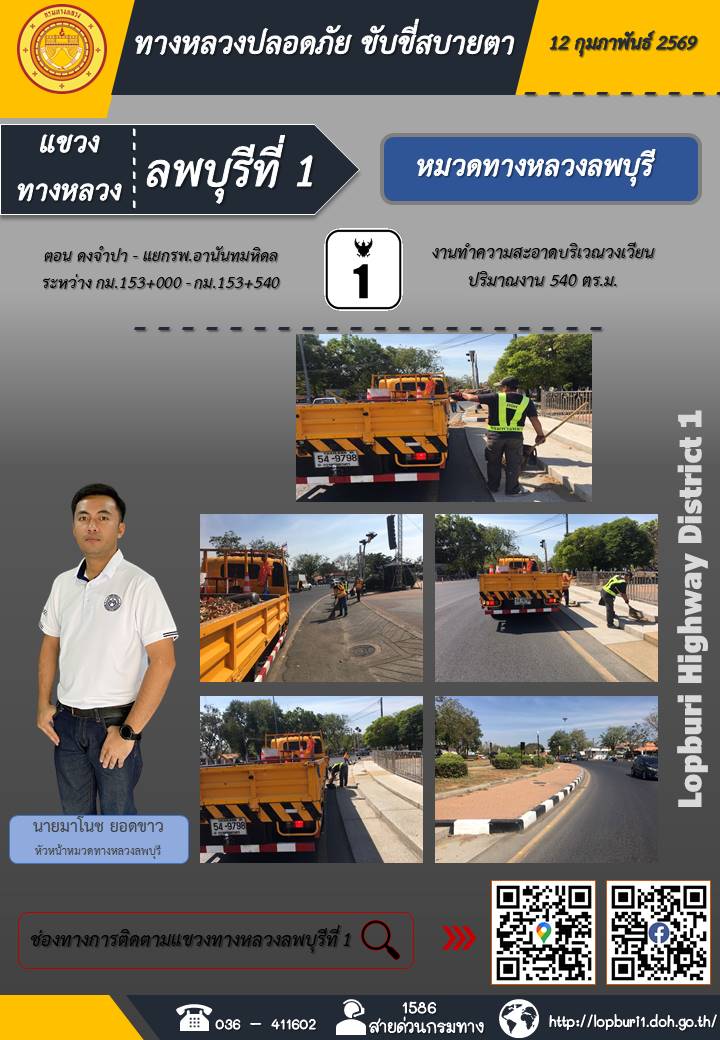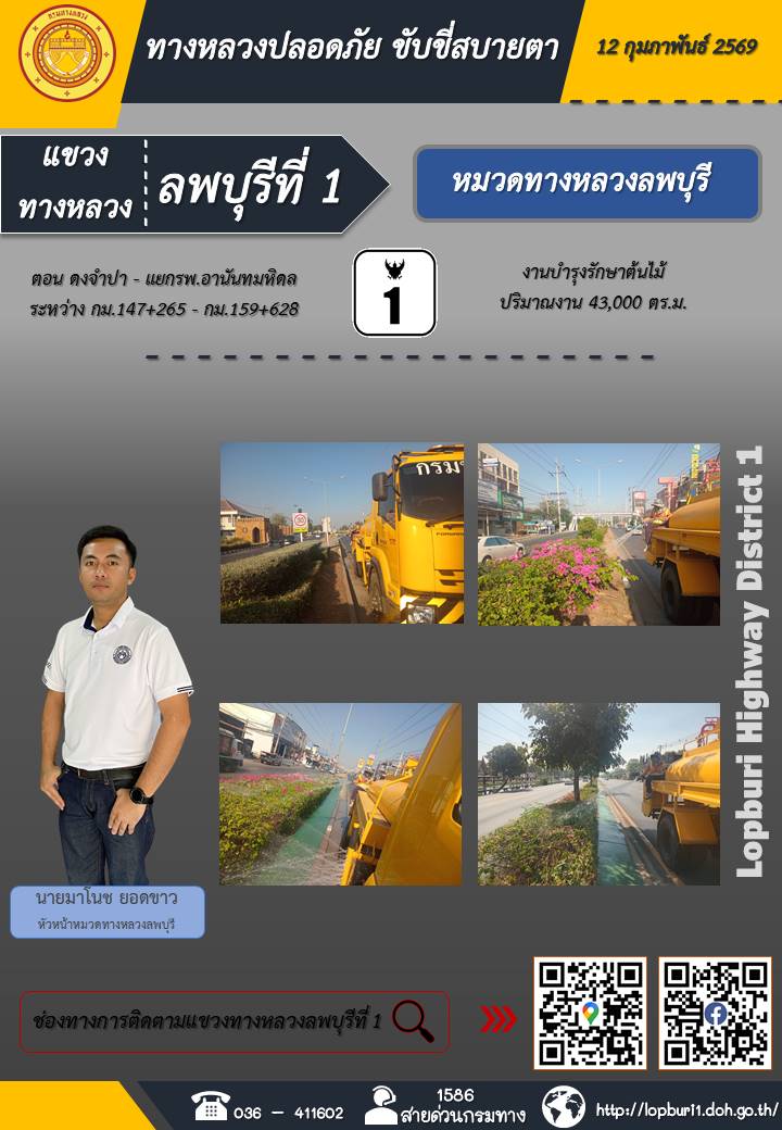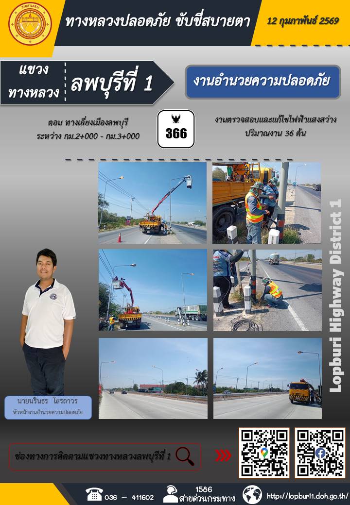 ทางหลวงปลอดภัยขับขี่สบายตา แขวงทางหลวงลพบุรีที่ 1 ประจำวันที่ 12 กุมภาพันธ์ 2569