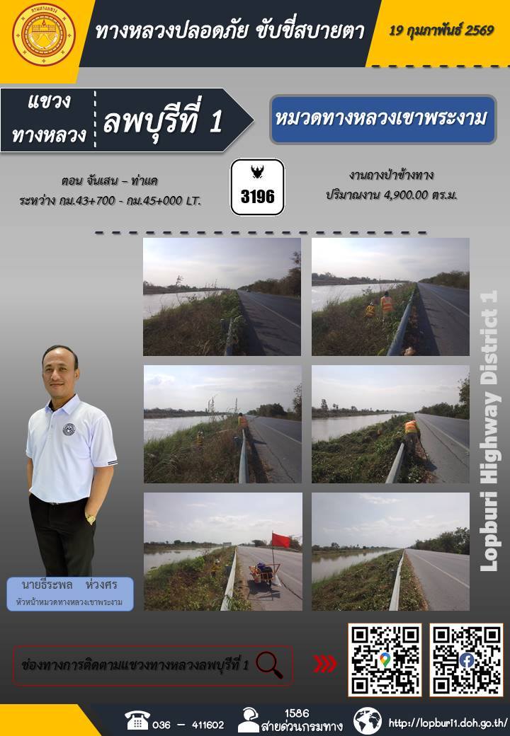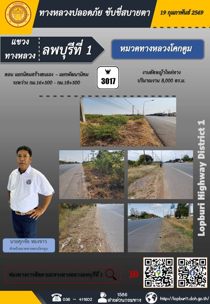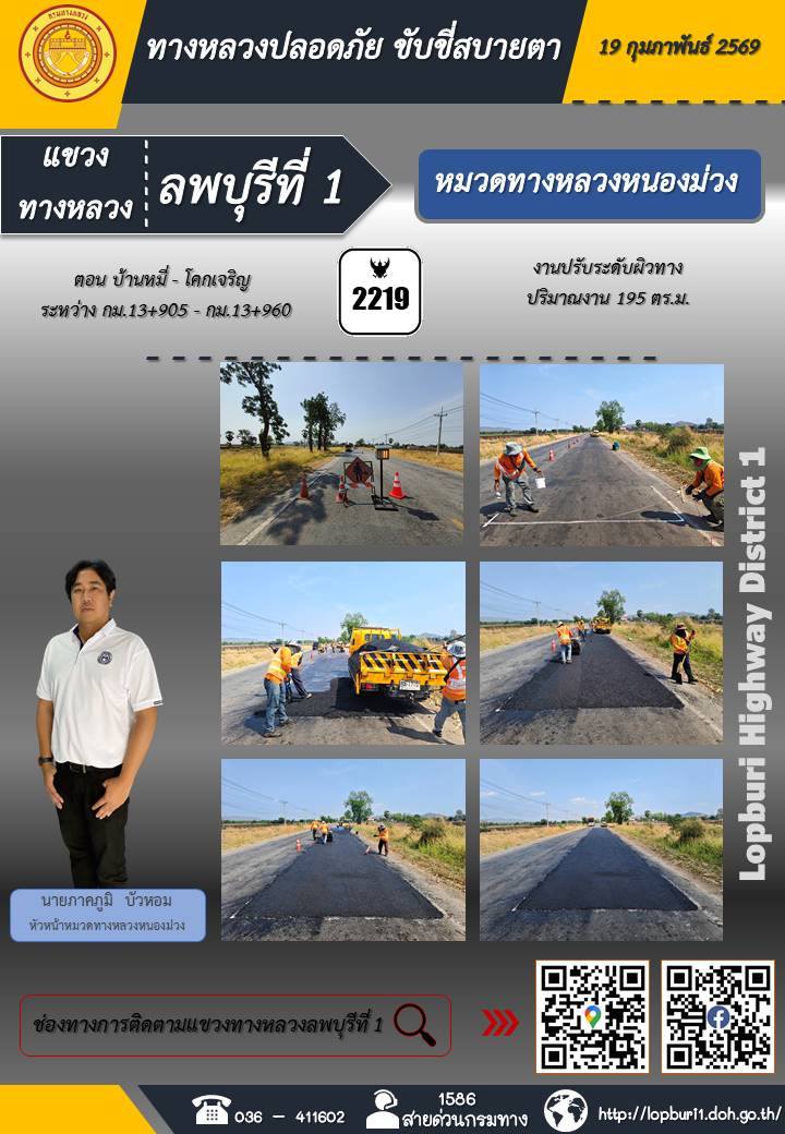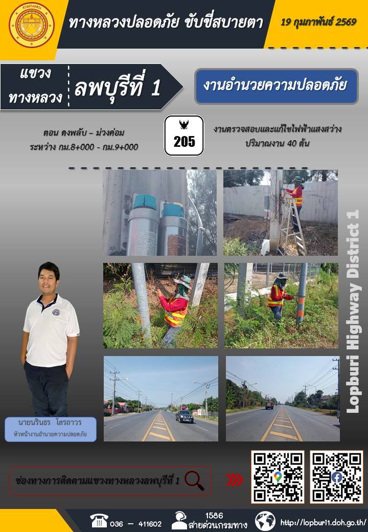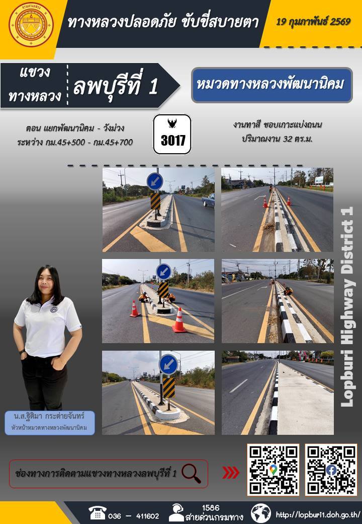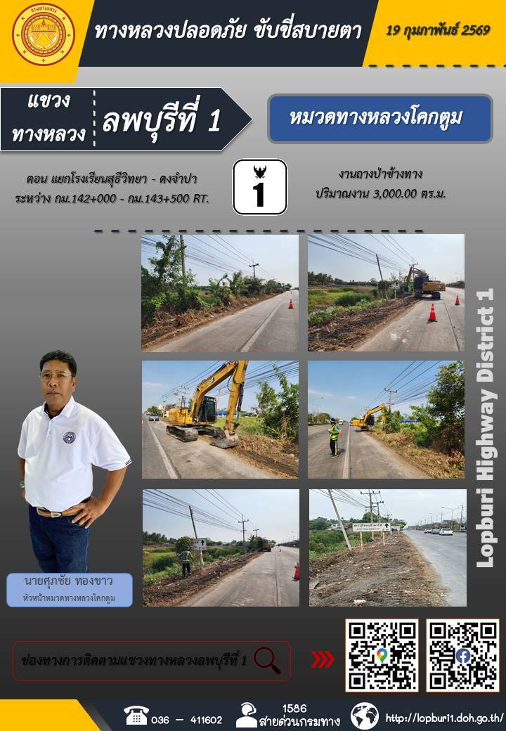 ทางหลวงปลอดภัยขับขี่สบายตา แขวงทางหลวงลพบุรีที่ 1 ประจำวันที่ 19 กุมภาพันธ์ 2569