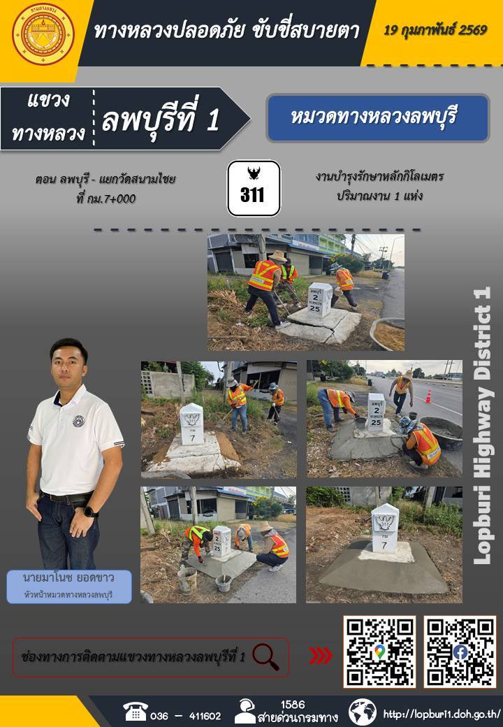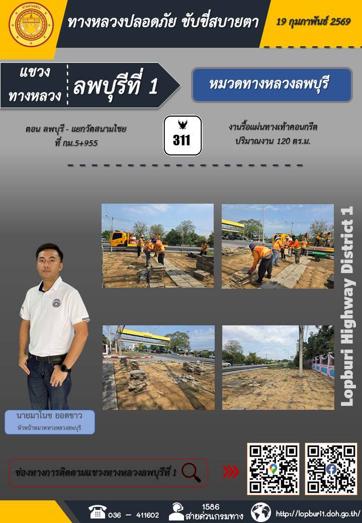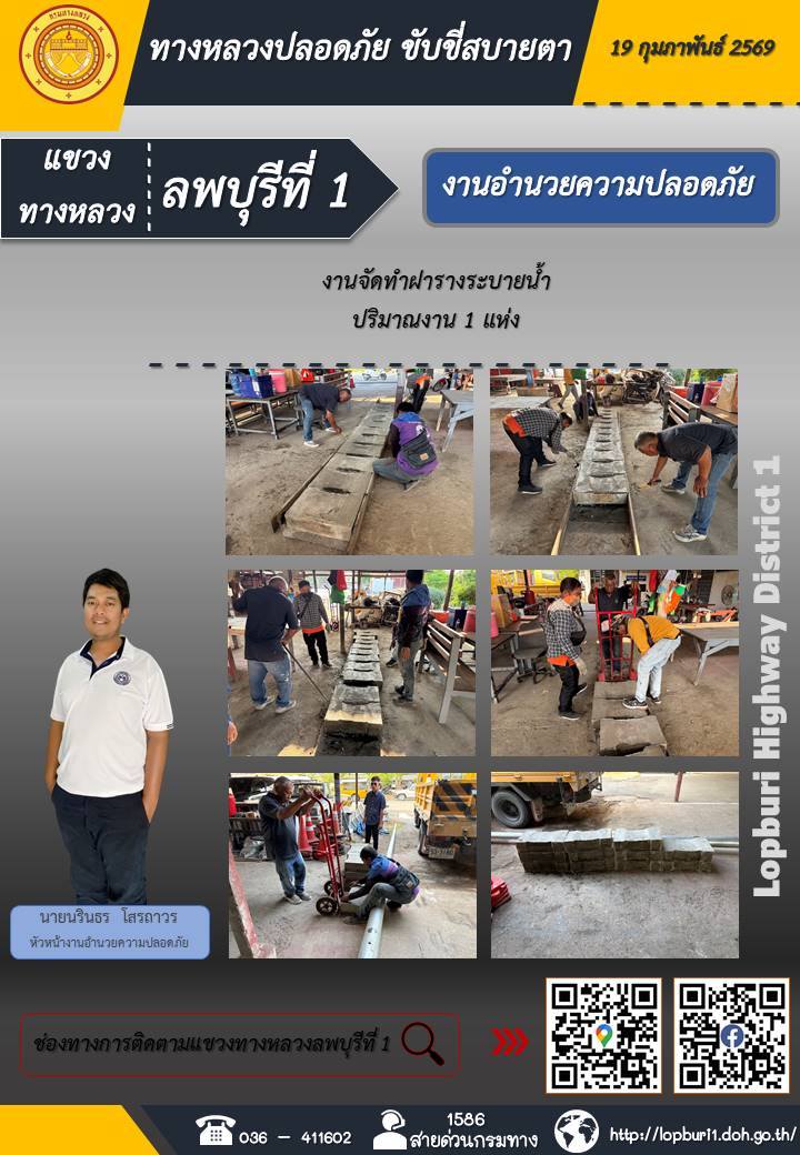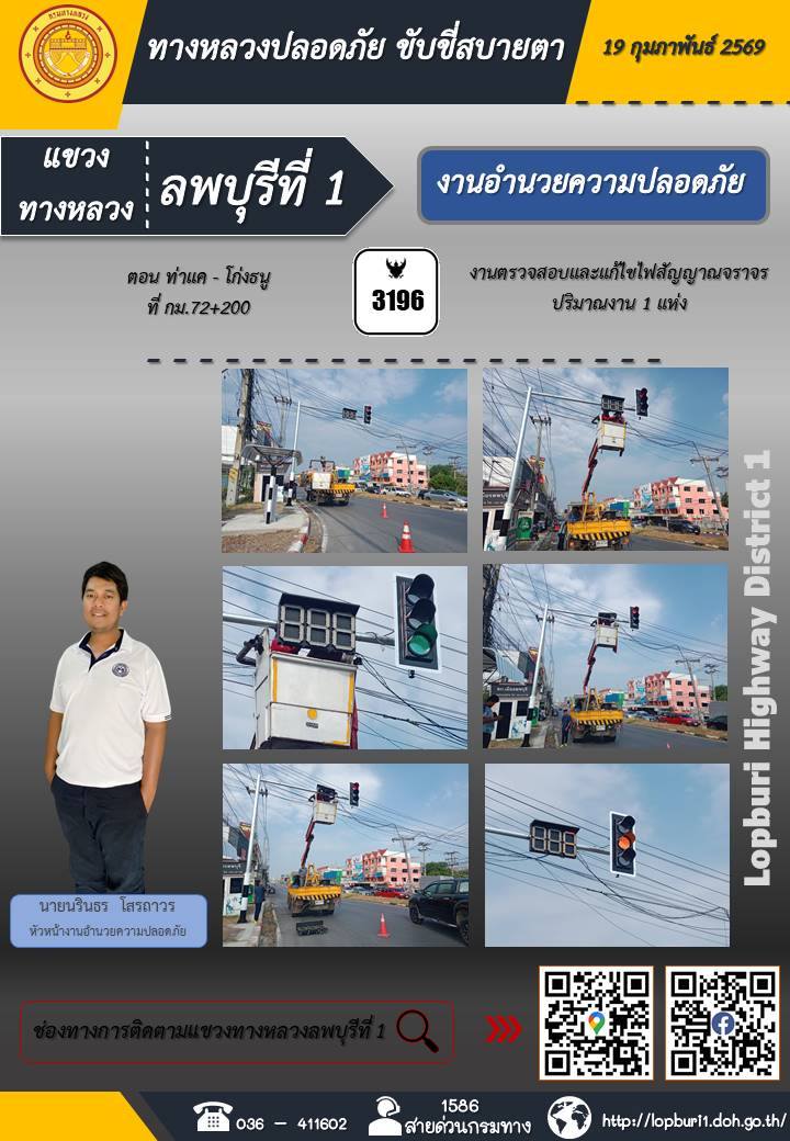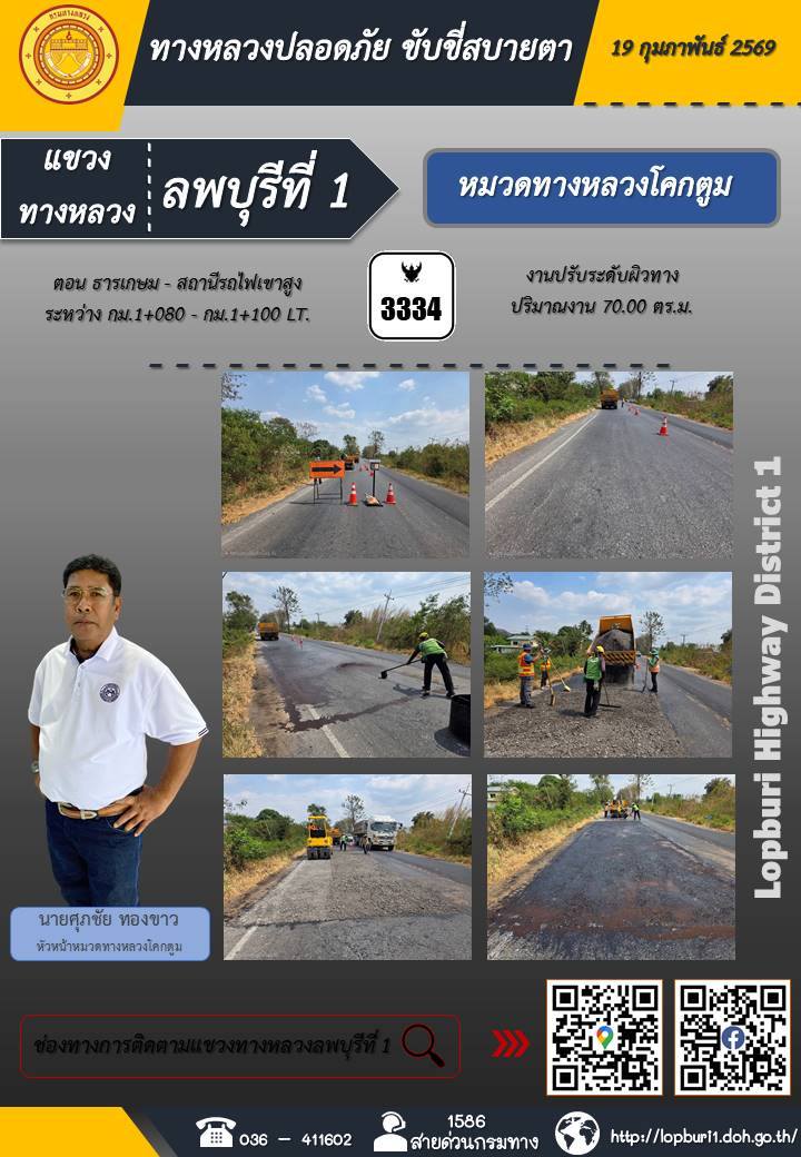 ทางหลวงปลอดภัยขับขี่สบายตา แขวงทางหลวงลพบุรีที่ 1 ประจำวันที่ 19 กุมภาพันธ์ 2569