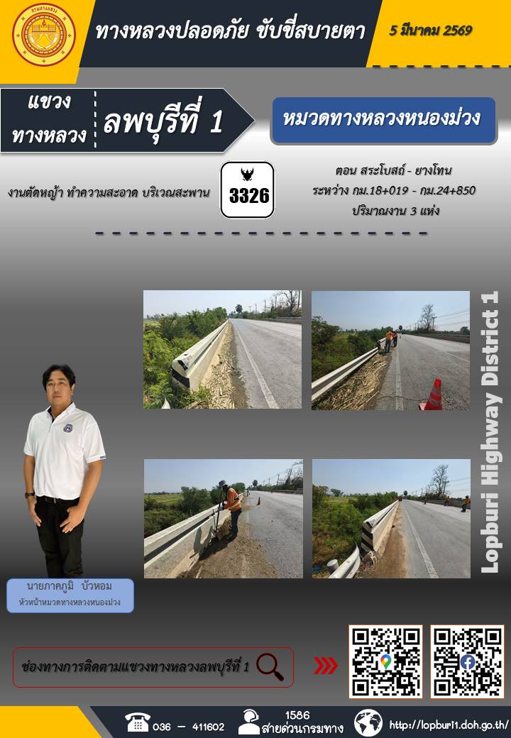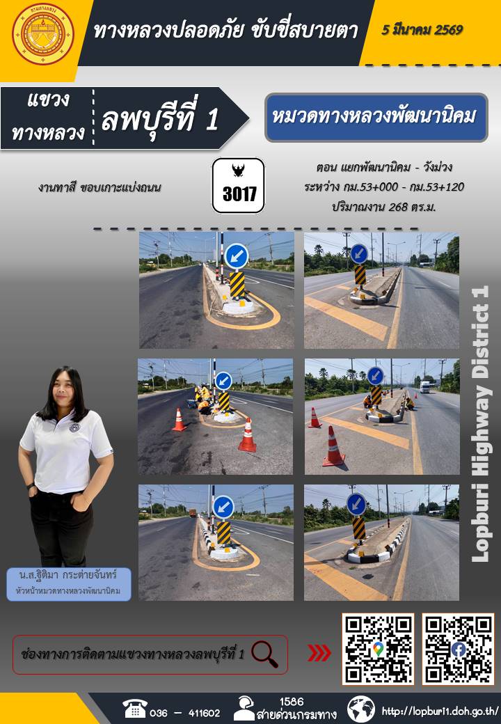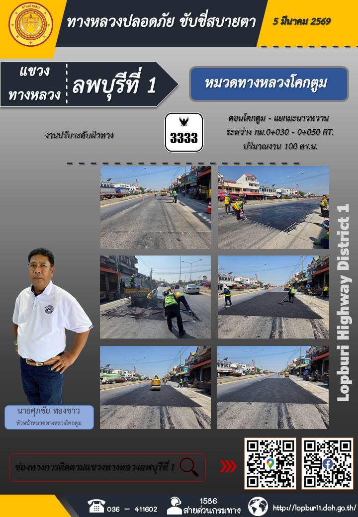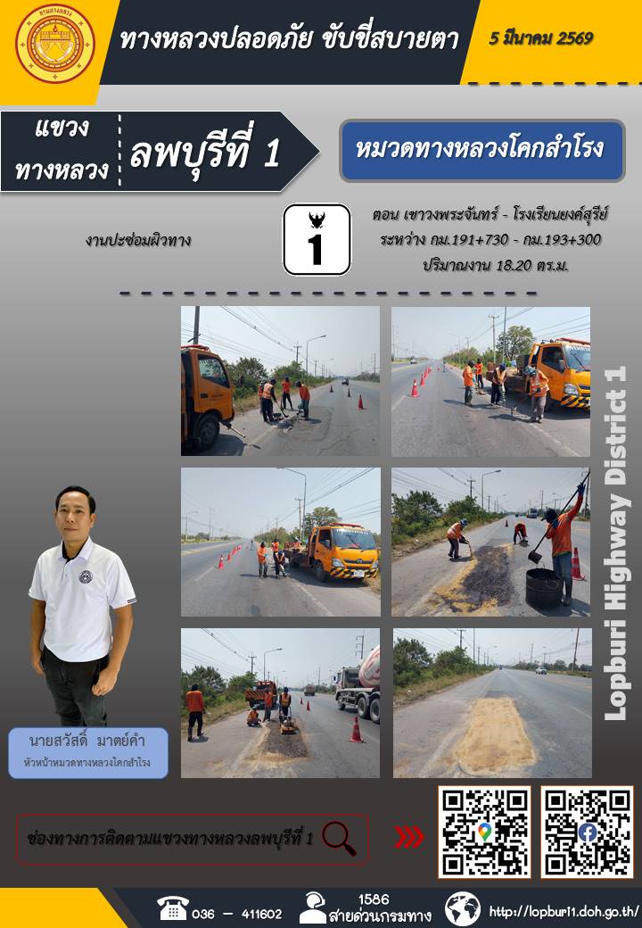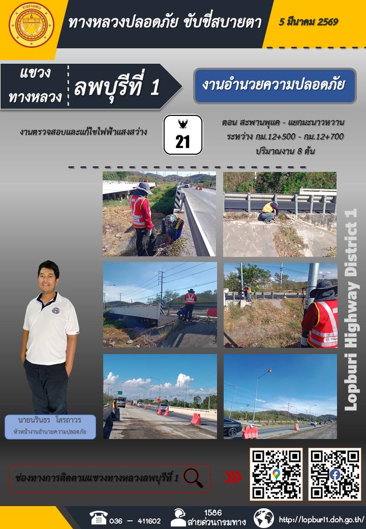 ทางหลวงปลอดภัยขับขี่สบายตา แขวงทางหลวงลพบุรีที่ 1 ประจำวันที่ 5 มีนาคม 2569