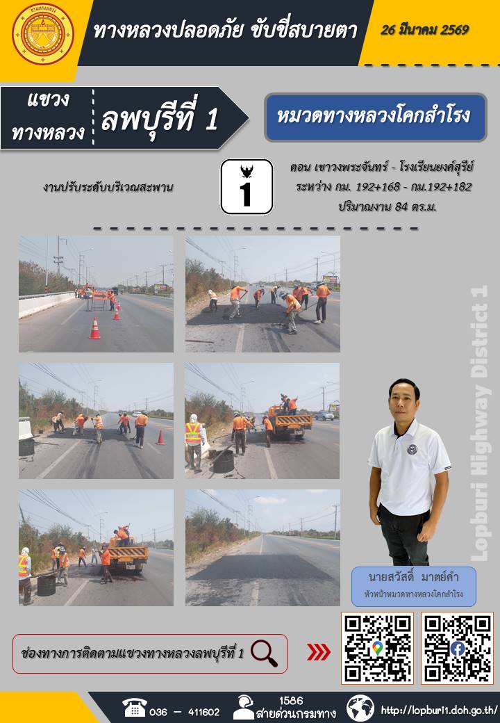 ทางหลวงปลอดภัยขับขี่สบายตา แขวงทางหลวงลพบุรีที่ 1 ประจำวันที่ 26 มีนาคม 2569