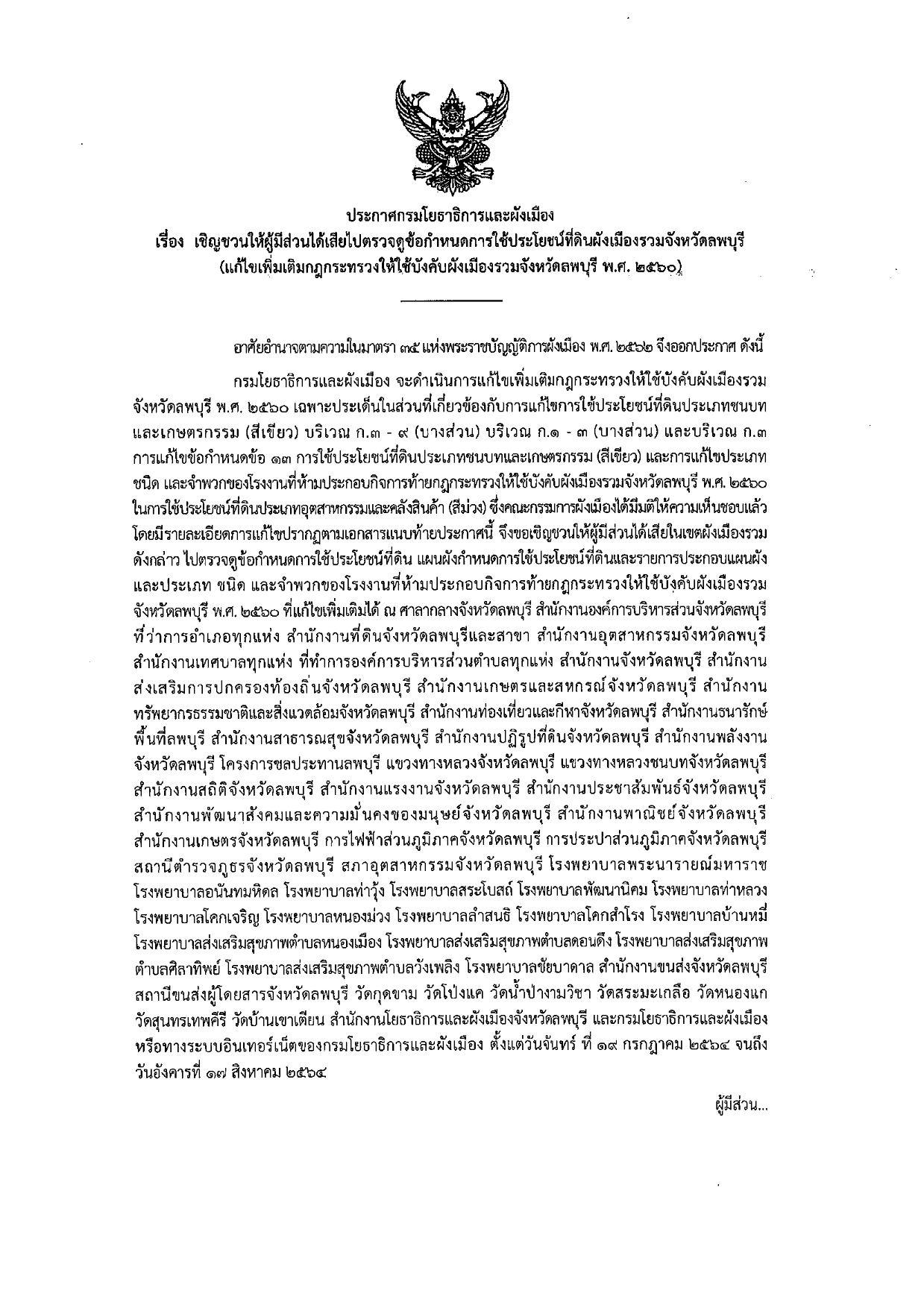 เรื่อง เชิญชวนให้ผู้มีส่วนร่วมได้เสียไปตรวจดูข้อกำหนดการใช้ประโยชน์ที่ดินผังเมืองรวมจังหวัดลพบุรี  (แก้ไขเพิ่มเติมกฎกระทรวงให้ใช้บังคับผังเมืองรวมจังหวัดลพบุรี พ.ศ.2560)