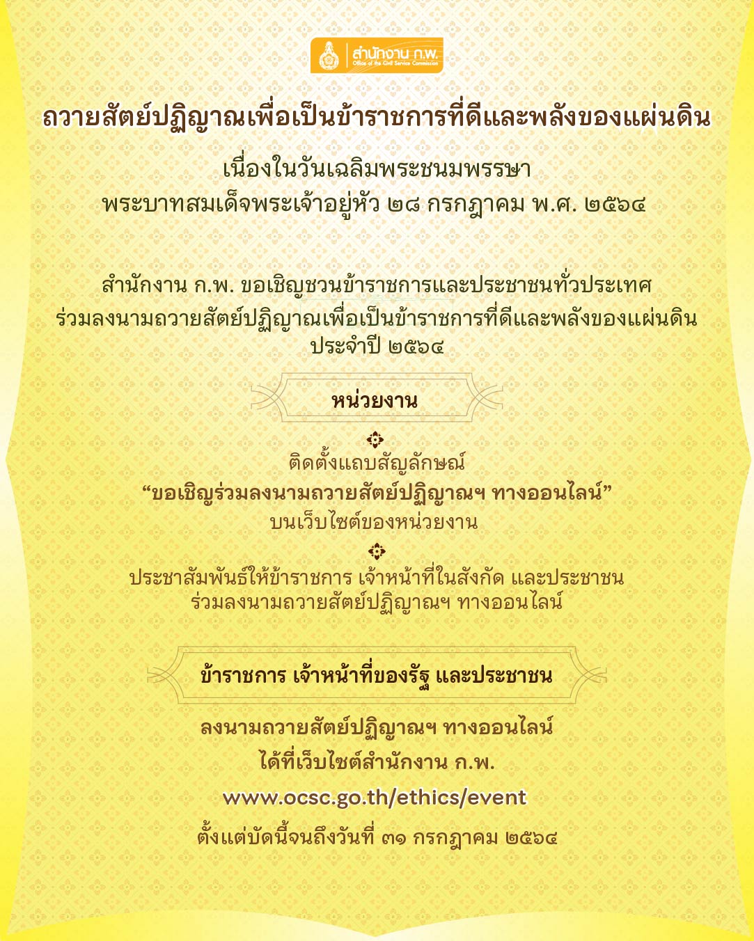 เนื่องในวันเฉลิมพระชนมพรรษาพระบาทสมเด็จพระเจ้าอยู่หัว ๒๘ กรกฎาคม ๒๕๖๔ สำนักงาน ก.พ. ระชาสัมพันธ์ให้ข้าราชการและเจ้าหน้าที่ในสังกัด ประชาชนร่วมลงนามถวายสัตย์ปฏิญาณฯ ทางออนไลน์