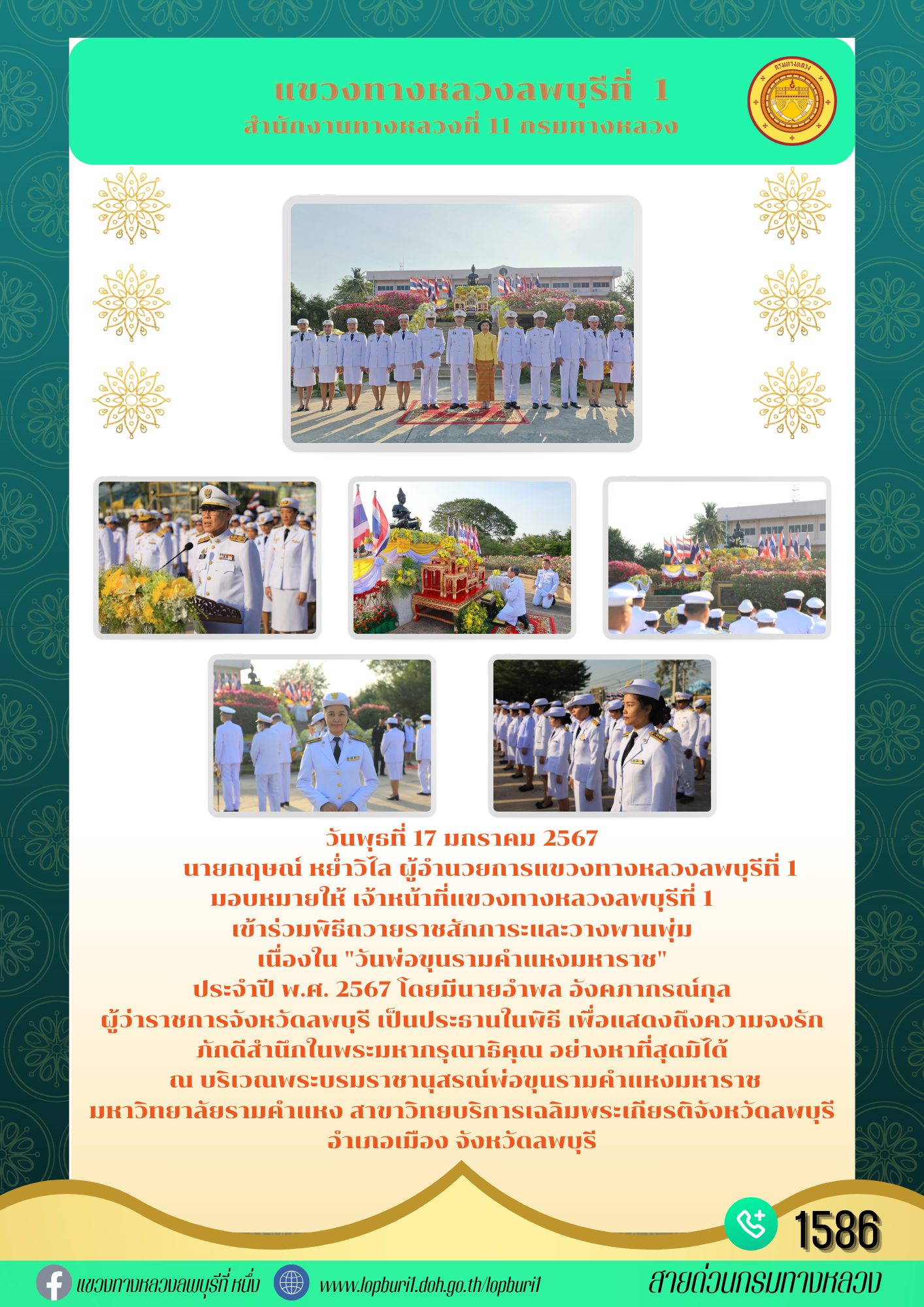 นายกฤษณ์ หย่ำวิไล ผู้อำนวยการแขวงทางหลวงลพบุรีที่ 1 มอบหมายให้ เจ้าหน้าที่แขวงทางหลวงลพบุรีที่ 1 เข้าร่วมพิธีถวายราชสักการะและวางพานพุ่ม เนื่องใน "วันพ่อขุนรามคำแหงมหาราช" ประจำปี พ.ศ. 2567 โดยมีนายอำพล อังคภากรณ์กุล ผู้ว่าราชการจังหวัดลพบุรี เป็นประธานในพิธี เพื่อแสดงถึงความจงรักภักดีสำนึกในพระมหากรุณาธิคุณ อย่างหาที่สุดมิได้