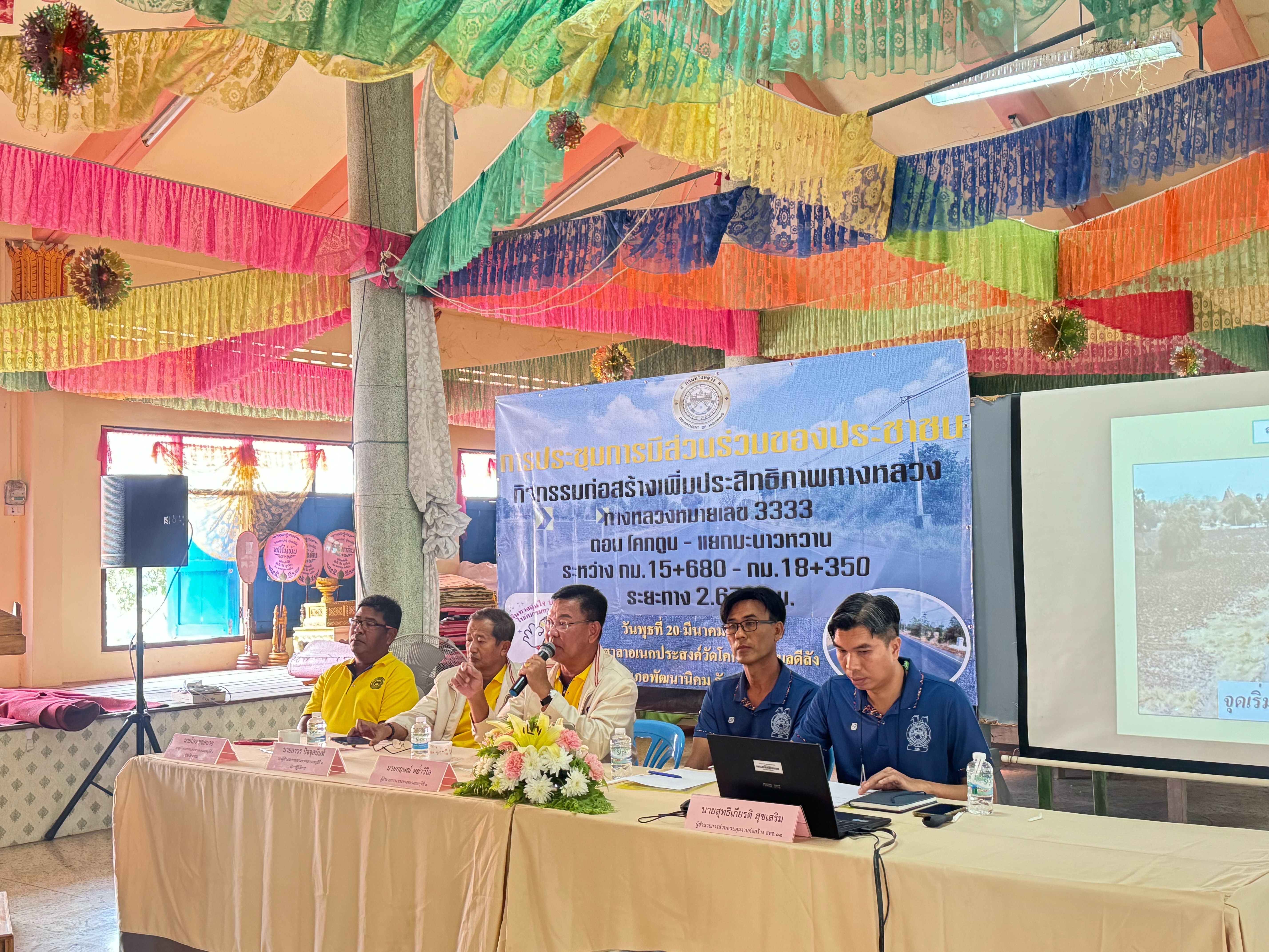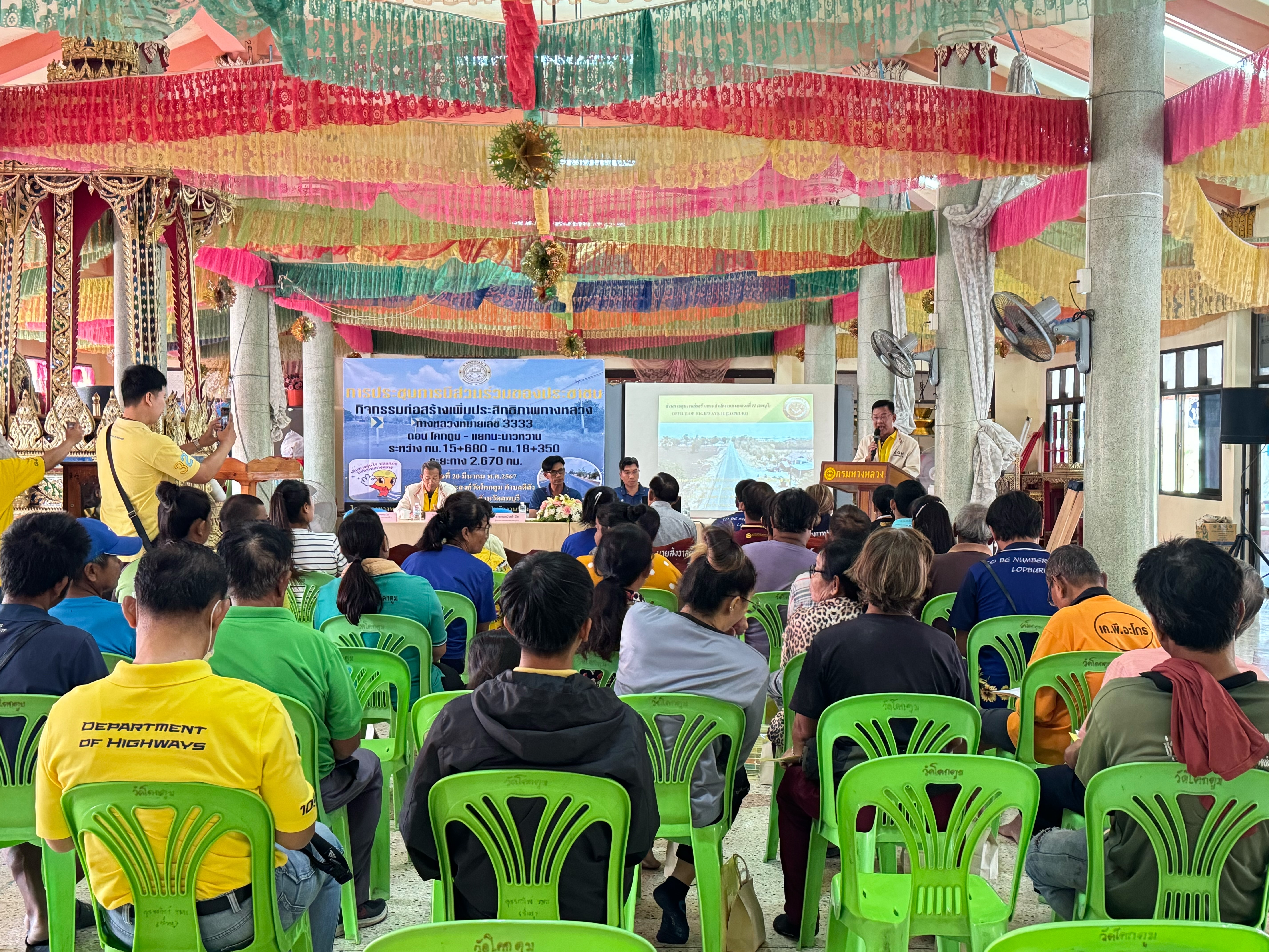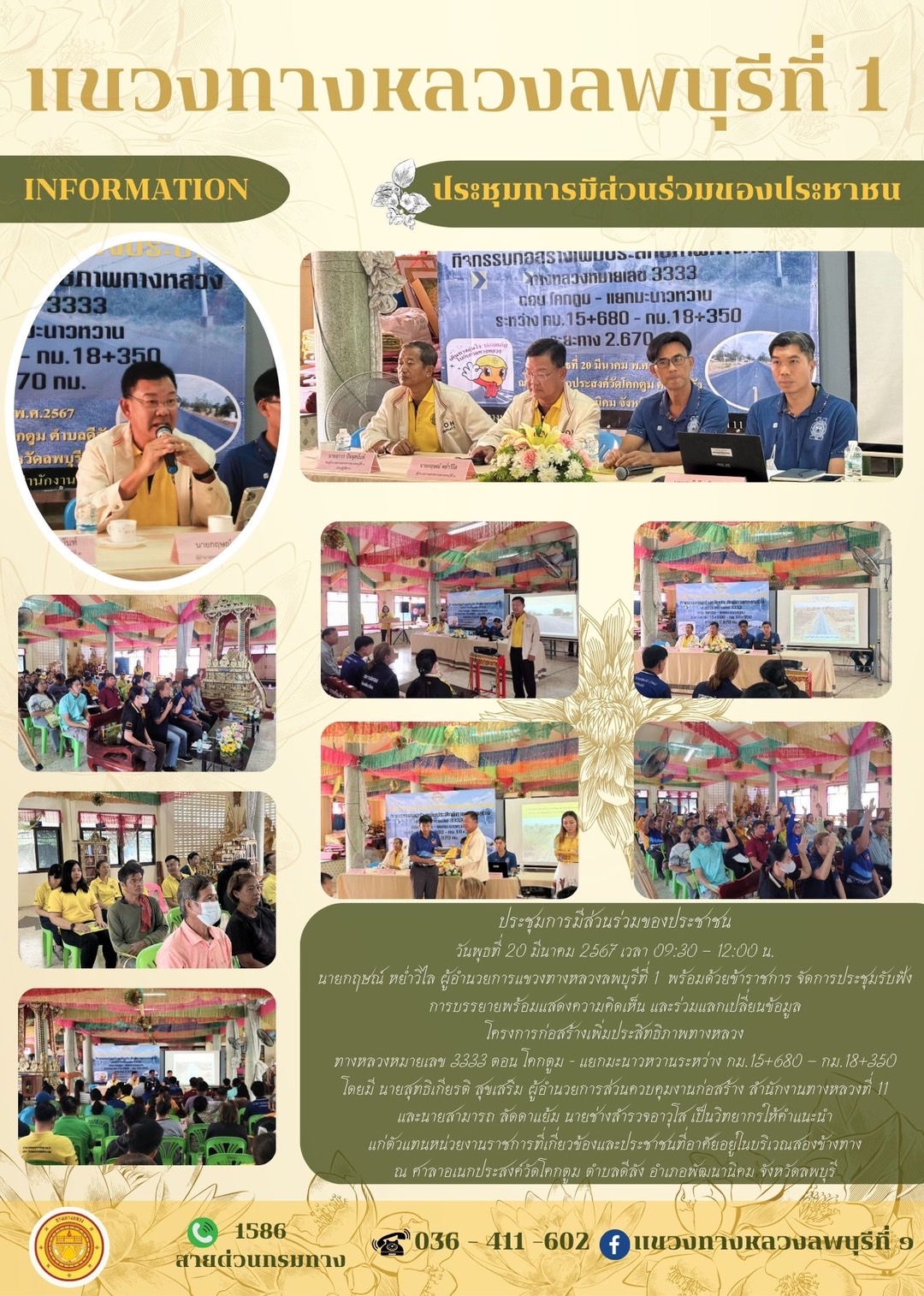 นายกฤษณ์ หย่ำวิไล ผู้อำนวยการแขวงทางหลวงลพบุรีที่ 1 พร้อมด้วยเจ้าหน้าที่แขวงทางหลวงลพบุรีที่ 1 จัดการประชุมรับฟังการบรรยายพร้อมแสดงความคิดเห็น และร่วมแลกเปลี่ยนข้อมูล โครงการก่อสร้างเพิ่มประสิทธิภาพทางหลวง ทางหลวงหมายเลข 3333 ตอน โคกตูม - แยกมะนาวหวาน ระหว่าง กม.15+680 – กม.18+350 โดยมีนายสุทธิเกียรติ สุขเสริม ผู้อำนวยการส่วนควบคุมงานก่อสร้าง สำนักงานทางหลวงที่ 11 และนายสามารถ ลัดดาแย้ม นายช่างสำรวจอาวุโส สำนักงานทางหลวงที่ 11 เป็นวิทยากรให้คำแนะนำแก่ตัวแทนหน่วยงานราชการที่เกี่ยวข้อง และประชาชนที่อาศัยอยู่ในบริเวณสองข้างทาง ณ ศาลาอเนกประสงค์วัดโคกตูม ตำบลดีลัง อำเภอพัฒนานิคม จังหวัดลพบุรี
