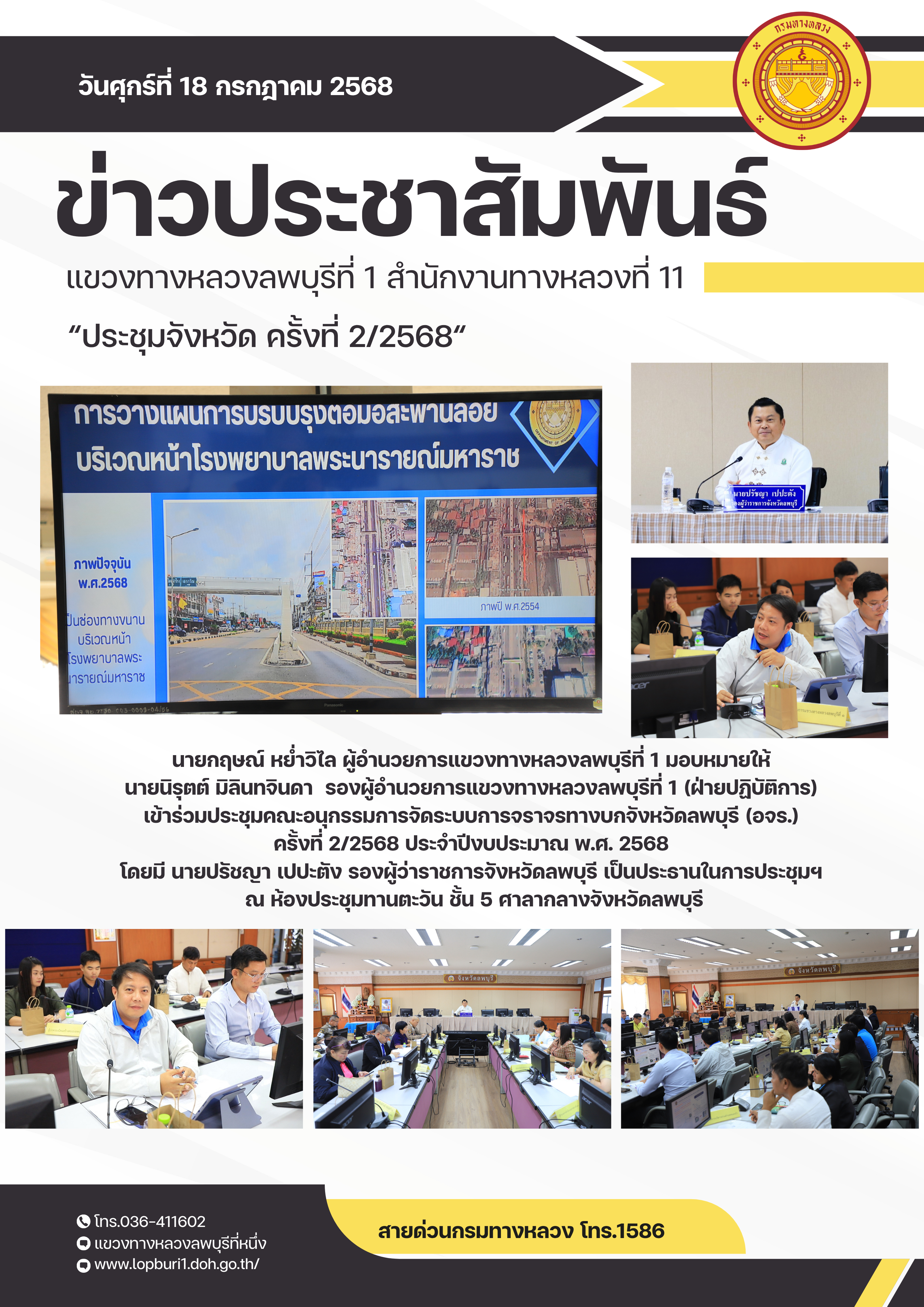 นายกฤษณ์ หย่ำวิไล ผู้อำนวยการแขวงทางหลวงลพบุรีที่ 1 มอบหมายให้ นายนิรุตต์ มิลินทจินดา รองผู้อำนวยการแขวงทางหลวงลพบุรีที่ 1 (ฝ่ายปฏิบัติการ) เข้าร่วมประชุมคณะอนุกรรมการจัดระบบการจราจรทางบกจังหวัดลพบุรี (อจร.) ครั้งที่ 2/2568 ประจำปีงบประมาณ พ.ศ. 2568 โดยมี นายปรัชญา เปปะตัง รองผู้ว่าราชการจังหวัดลพบุรี เป็นประธานในการประชุมฯ ณ ห้องประชุมทานตะวัน ชั้น 5 ศาลากลางจังหวัดลพบุรี