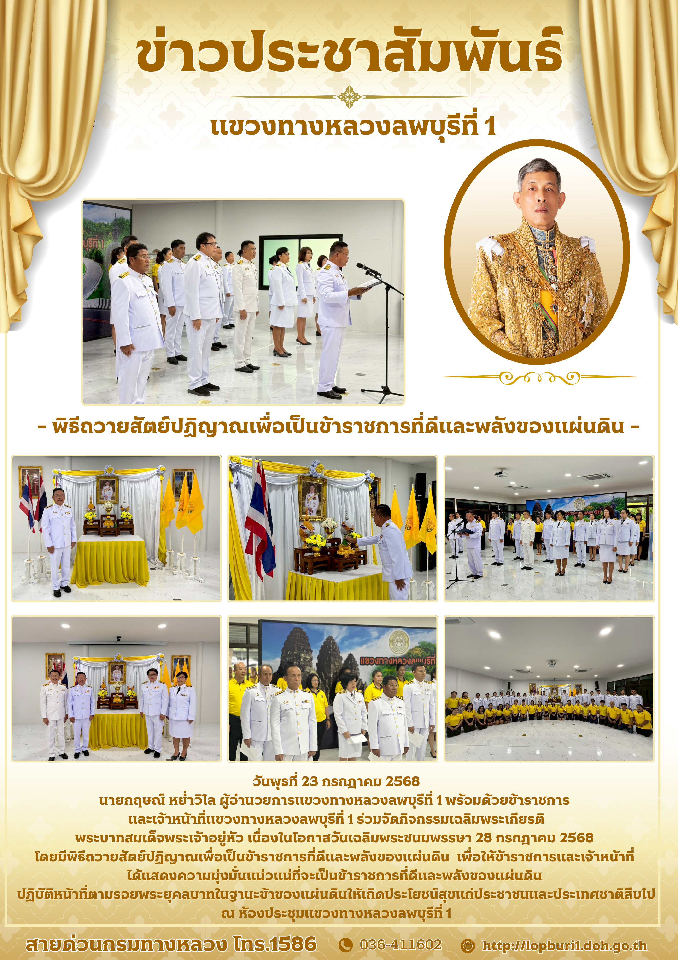 และเจ้าหน้าที่แขวงทางหลวงลพบุรีที่ 1 ร่วมจัดกิจกรรมเฉลิมพระเกียรติพระบาทสมเด็จพระเจ้าอยู่หัว เนื่องในโอกาสวันเฉลิมพระชนมพรรษา 28 กรกฎาคม 2568 โดยมีพิธีถวายสัตย์ปฏิญาณเพื่อเป็นข้าราชการที่ดีและพลังของแผ่นดิน เพื่อให้ข้าราชการและเจ้าหน้าที่ ได้แสดงความมุ่งมั่นแน่วแน่ที่จะเป็นข้าราชการที่ดีและพลังของแผ่นดินปฏิบัติหน้าที่ตามรอยพระยุคลบาทในฐานะข้าของแผ่นดินให้เกิดประโยชน์สุขแก่ประชาชนและประเทศชาติสืบไป ณ ห้องประชุมแขวงทางหลวงลพบุรีที่ 1