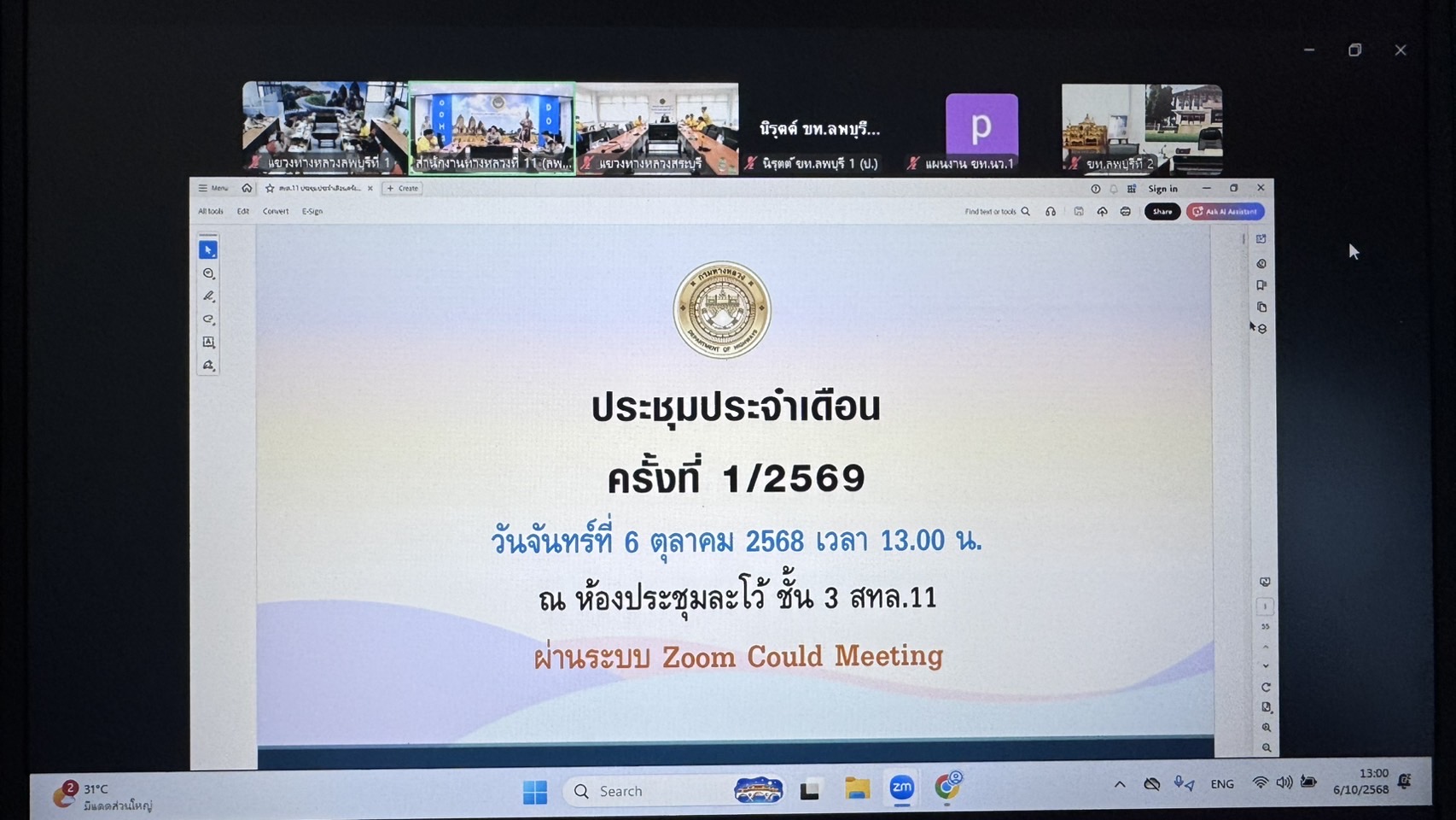 ข้าราชการ และเจ้าหน้าที่แขวงฯ เข้าร่วมประชุมประจำเดือน ครั้งที่ 1/2569 ของสำนักงานทางหลวงที่ 11 ติดตามผลการดำเนินงานของแขวงทางหลวงในสังกัด ชี้แจงงาน พรบ.ปี 2568 ที่กันเหลื่อมปี รายงานผลการลงนามในสัญญา พรบ.ปี 2569 รายงานผลการดำเนินงานงบกระตุ้นเศรษฐกิจ พรบ.ปี 2568 การบริหารงบบำรุงปกติ ผลการปฏิบัติงานในรอบ 1 เดือน งานบำรุงรักษาทาง นโยบายทางแยกรัศมี 250 เมตร นโยบายทางเท้า นโยบายโครงการเก็บขยะในเขตทางหลวง และเรื่องอื่น ๆ ผ่านระบบ Zoom Cloud Meeting ณ ห้องประชุมแขวงทางหลวงลพบุรีที่ 1 (อาคาร 113 ปี กรมทางหลวง)