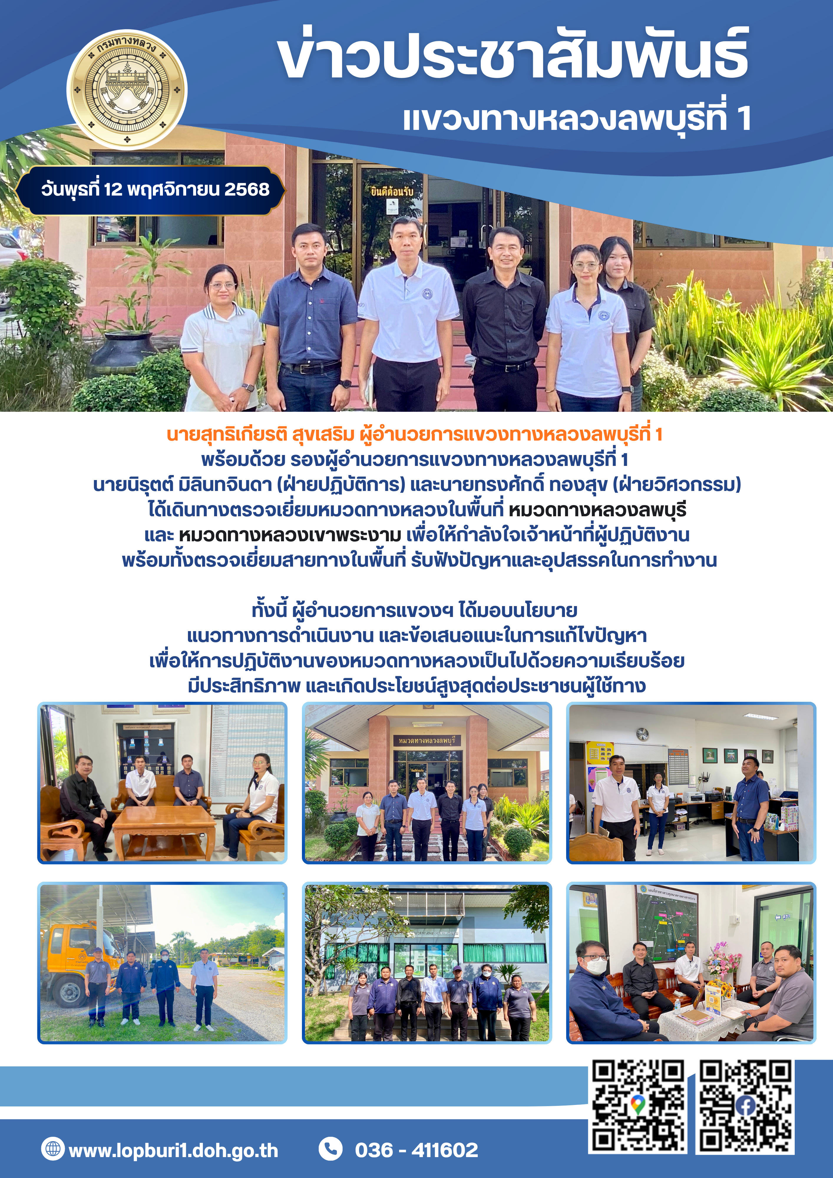 นายสุทธิเกียรติ สุขเสริม ผู้อำนวยการแขวงทางหลวงลพบุรีที่ 1 พร้อมด้วย รองผู้อำนวยการแขวงทางหลวงลพบุรีที่ 1 นายนิรุตต์ มิลินทจินดา (ฝ่ายปฏิบัติการ) และ นายทรงศักดิ์ ทองสุข (ฝ่ายวิศวกรรม)
