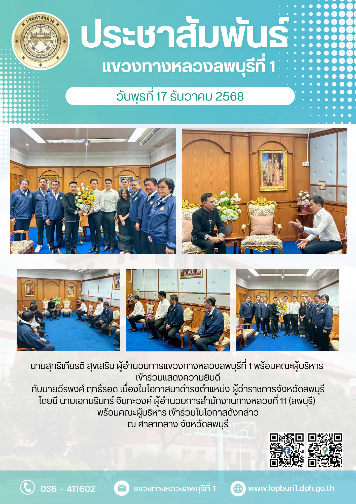 นายสุทธิเกียรติ สุขเสริม ผู้อำนวยการแขวงทางหลวงลพบุรีที่ 1 พร้อมคณะผู้บริหาร เข้าร่วมแสดงความยินดีกับ