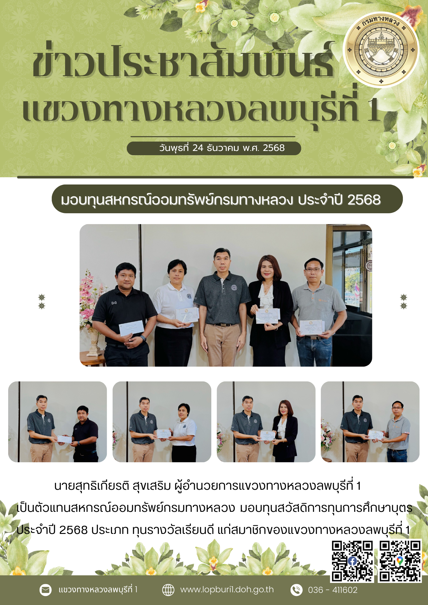 เป็นตัวแทนสหกรณ์ออมทรัพย์กรมทางหลวง มอบทุนสวัสดิการทุนการศึกษาบุตรประจำปี 2568 ประเภท ทุนรางวัลเรียนดี แก่สมาชิกของแขวงทางหลวงลพบุรีที่ 1