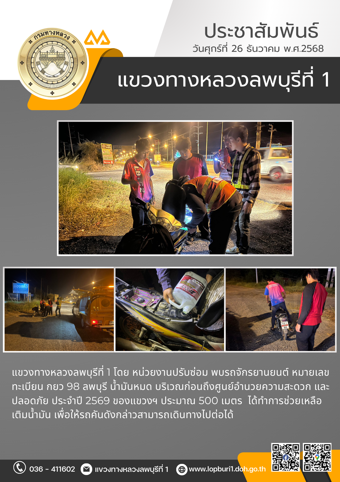 แขวงทางหลวงลพบุรีที่ 1 โดย หน่วยงานปรับซ่อม พบรถจักรยานยนต์ หมายเลขทะเบียน กยว 98 ลพบุรี น้ำมันหมด บริเวณก่อนถึงศูนย์อำนวยความสะดวก และปลอดภัย ประจำปี 2569 ของแขวงฯ ประมาณ 500 เมตร ได้ทำการช่วยเหลือเติมน้ำมัน เพื่อให้รถคันดังกล่าวสามารถเดินทางไปต่อได้