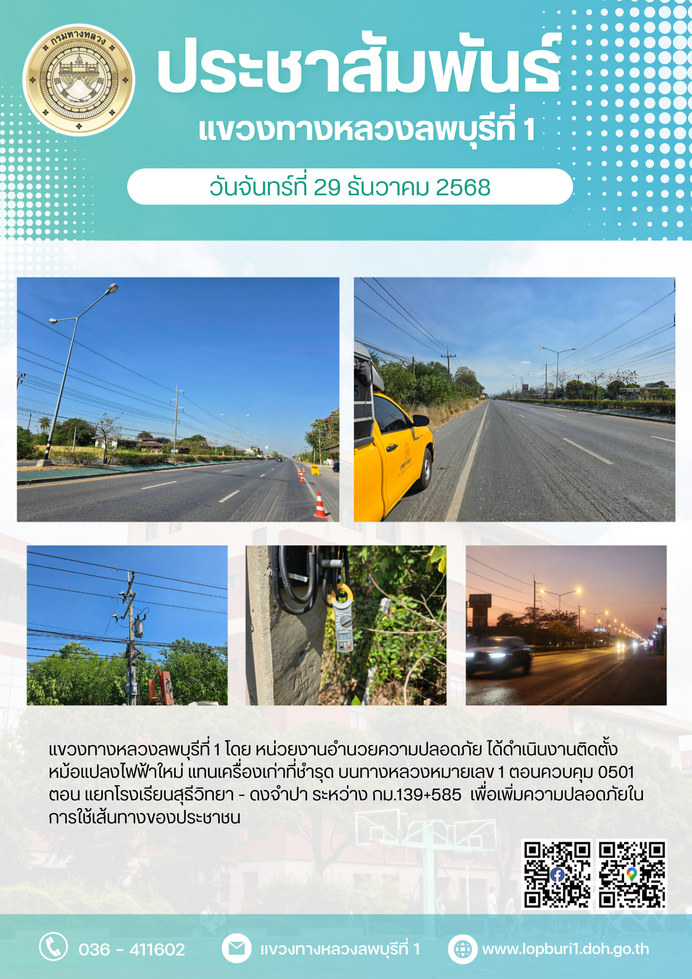 แขวงทางหลวงลพบุรีที่ 1 โดย หน่วยงานอำนวยความปลอดภัย ได้ดำเนินงานติดตั้งหม้อแปลงไฟฟ้าใหม่ แทนเครื่องเก่าที่ชำรุด บนทางหลวงหมายเลข 1 ตอนควบคุม 0501 ตอน แยกโรงเรียนสุธีวิทยา - ดงจำปา ระหว่าง กม.139+585 เพื่อเพิ่มความปลอดภัยใน การใช้เส้นทางของประชาชน