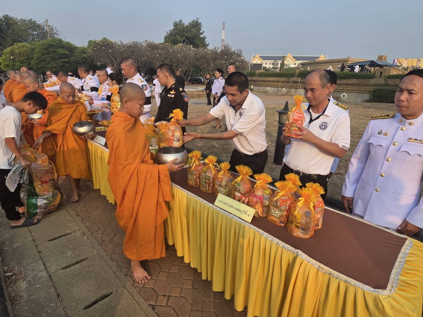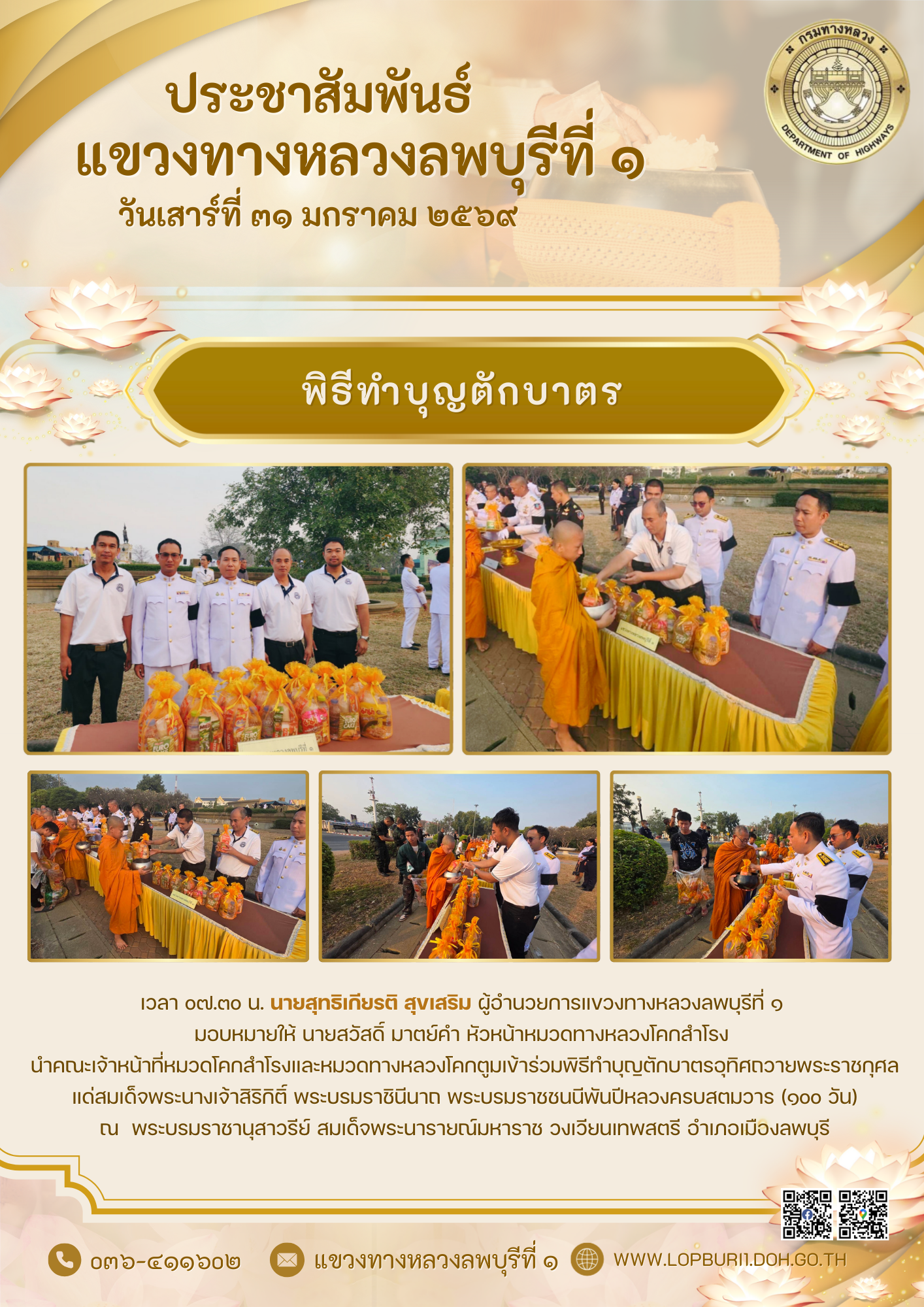 เวลา o๗.๓o น. นายสุทธิเกียรติ สุขเสริม ผู้อำนวยการแขวงทางหลวงลพบุรีที่ ๑ มอบหมายให้ นายสวัสดิ์ มาตย์คำ หัวหน้าหมวดทางหลวงโคกสำโรง นำคณะเจ้าหน้าที่หมวดโคกสำโรงและหมวดทางหลวงโคกตูมเข้าร่วมพิธีทําบุญตักบาตรอุทิศถวายพระราชกุศล แด่สมเด็จพระนางเจ้าสิริกิติ์ พระบรมราชินีนาถ พระบรมราชชนนีพันปีหลวงครบสตมวาร (๑oo วัน)