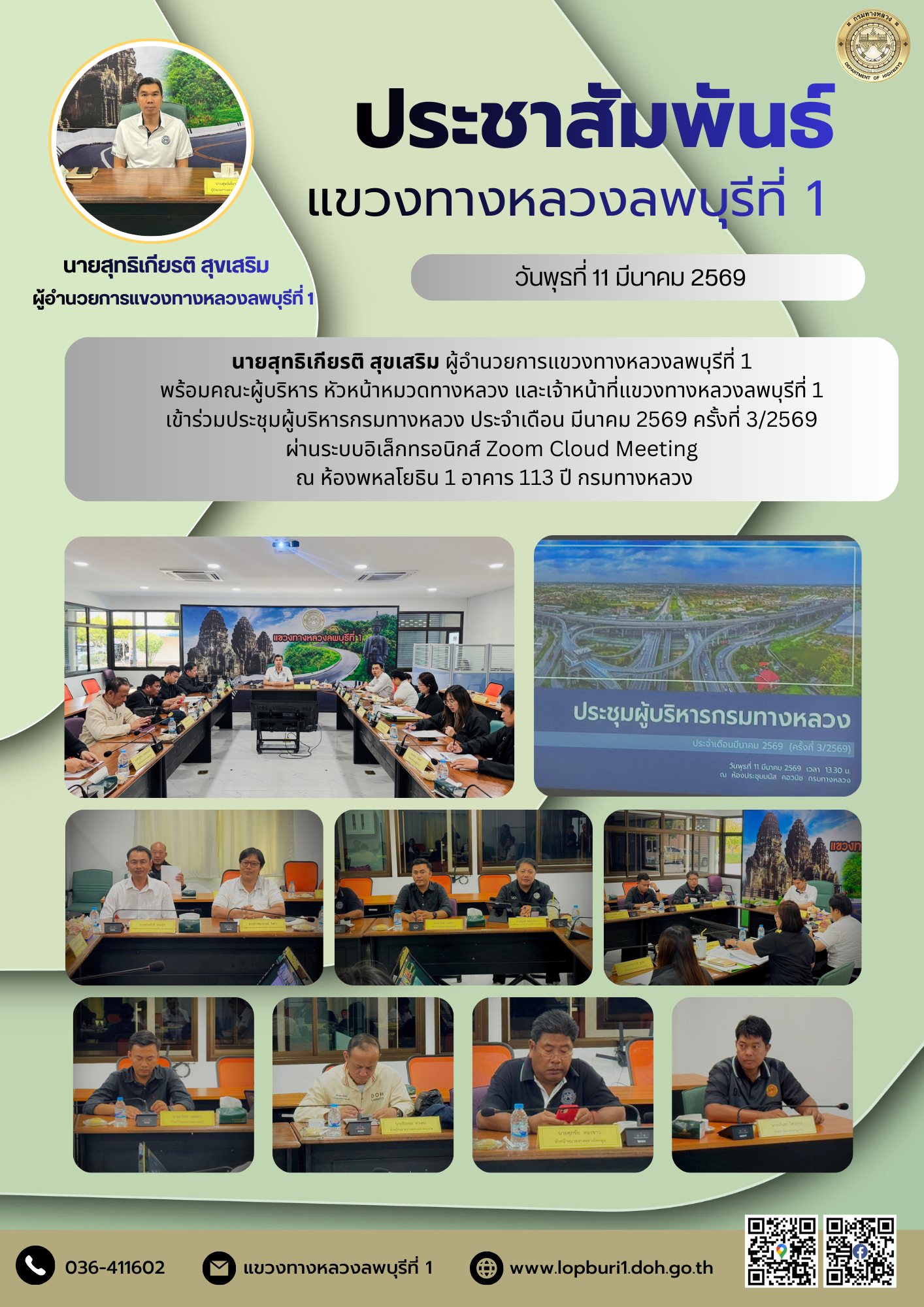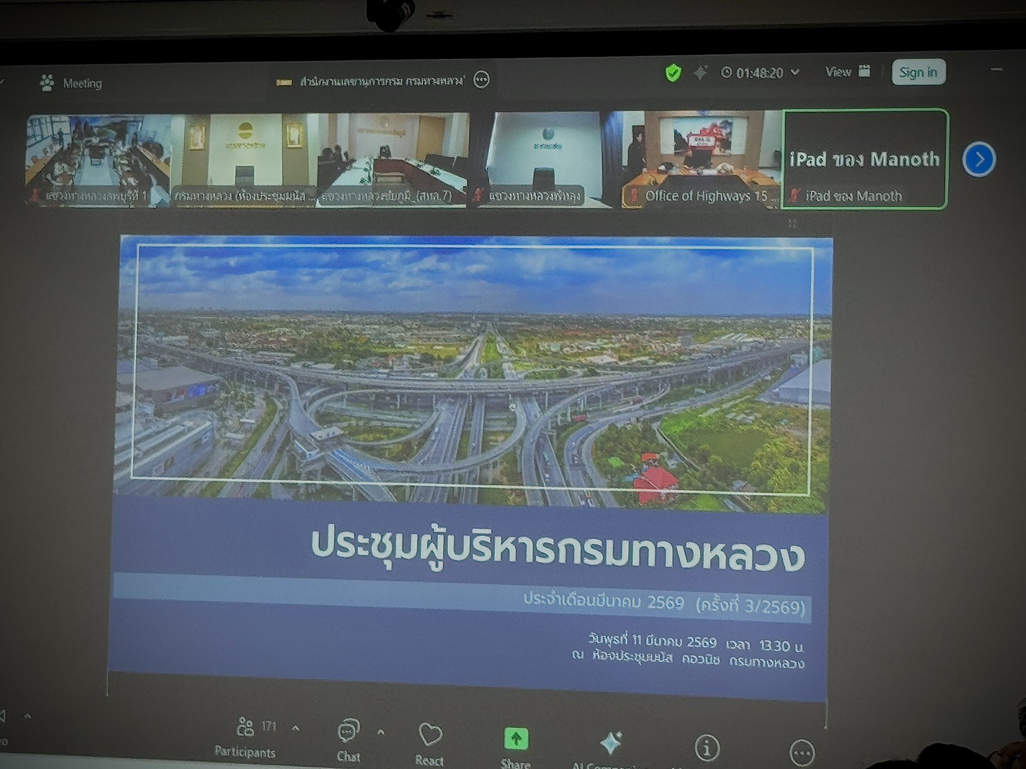 เข้าร่วมประชุมผู้บริหารกรมทางหลวง ประจำเดือน มีนาคม 2569 ครั้งที่ 3/2569 ผ่านระบบอิเล็กทรอนิกส์ Zoom Cloud Meeting ณ ห้องพหลโยธิน 1 อาคาร 113 ปี กรมทางหลวง