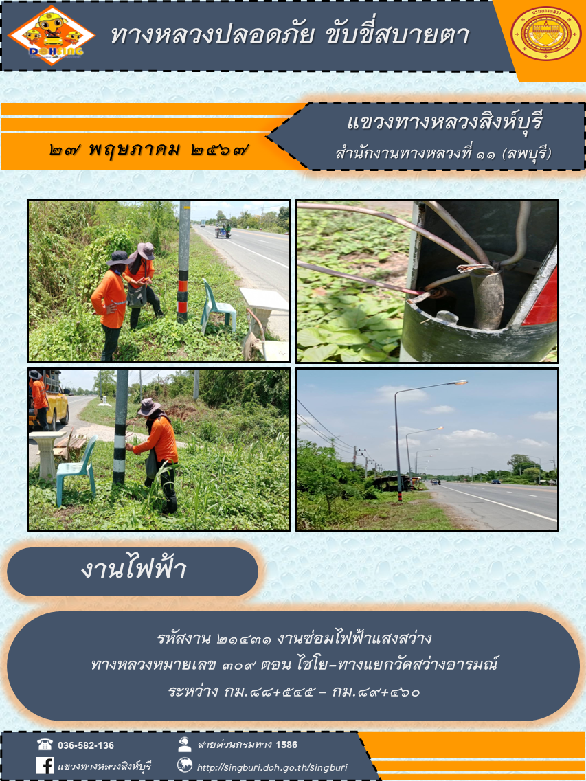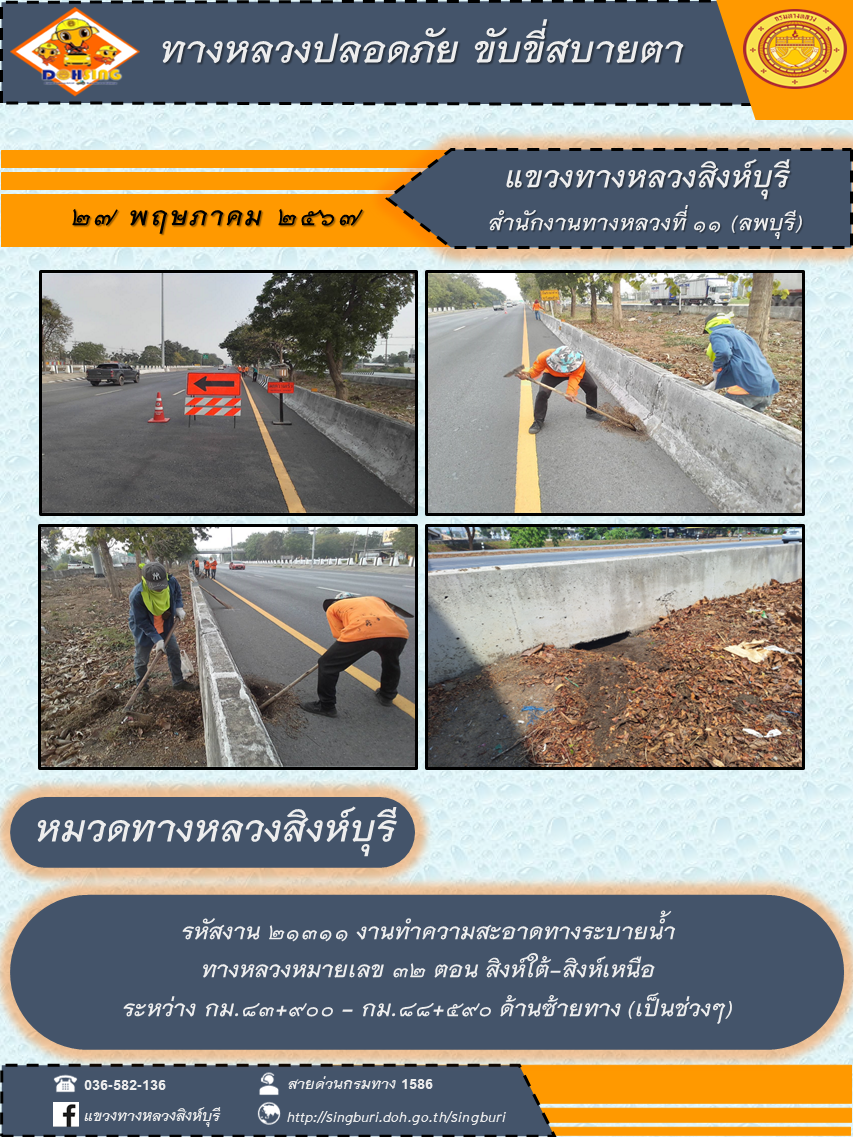 ผลการปฏิบัติงาน ตั้งแต่วันที่ 20 - 24 พฤษภาคม 2567 แขวงทางหลวงสิงห์บุรี