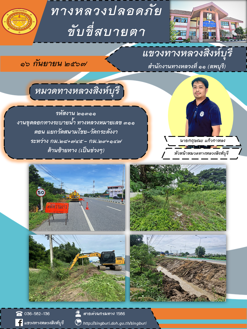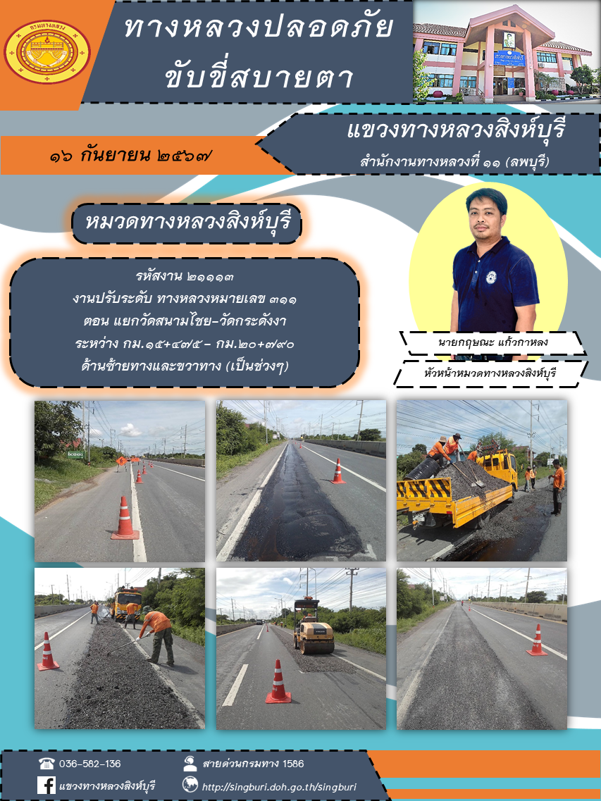 ข้อมูลภาพกิจกรรม : ผลการปฏิบัติงาน ตั้งแต่วันที่ 9-13 กันยายน 2567 แขวงทางหลวงสิงห์บุรี