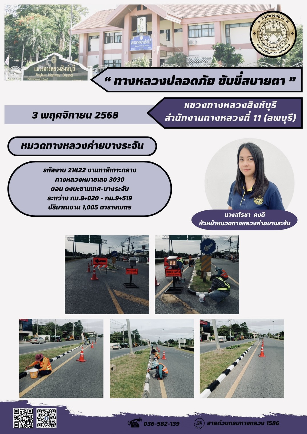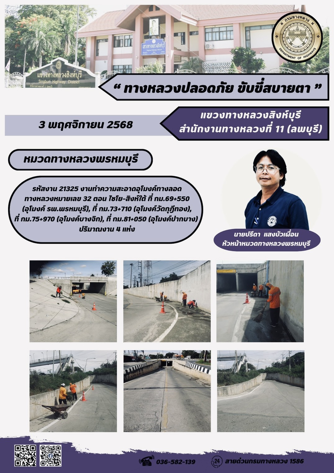 ผลการปฏิบัติงานวันที่ 23-29 ตุลาคม 2568 แขวงทางหลวงสิงห์บุรี สำนักงานทางหลวงที่ 11(ลพบุรี) กรมทางหลวง
