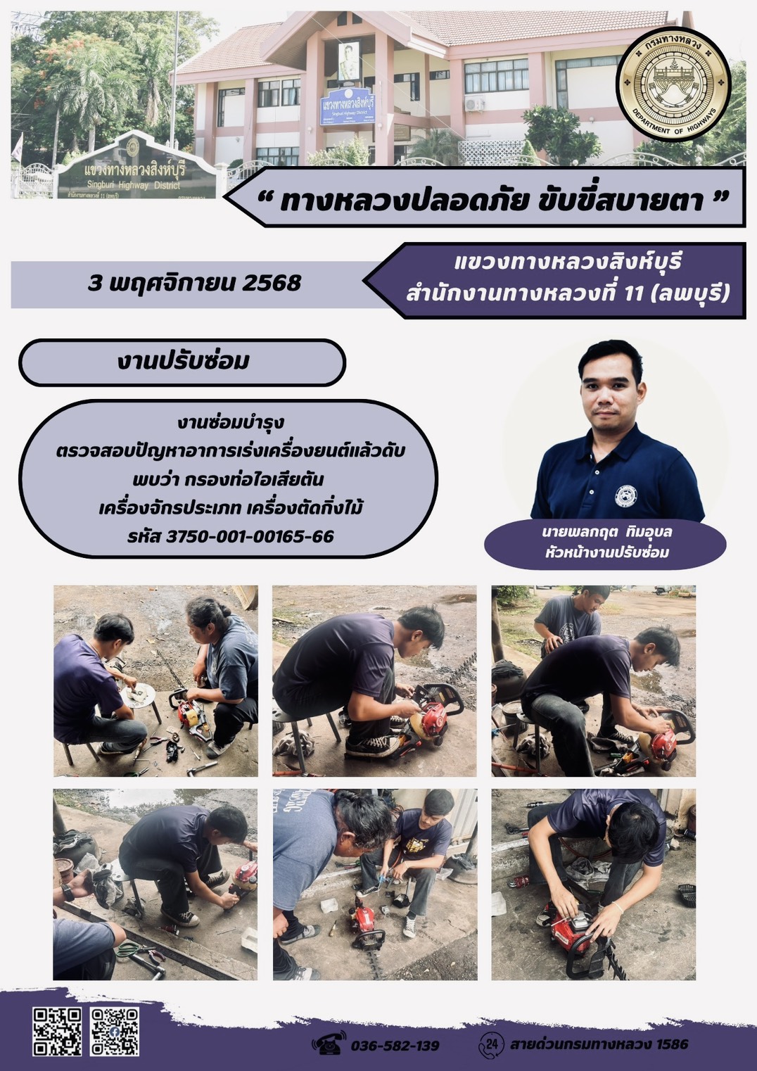 ข้อมูลภาพกิจกรรม : ผลการปฏิบัติงานวันที่ 23-29 ตุลาคม 2568 แขวงทางหลวงสิงห์บุรี สำนักงานทางหลวงที่ 11(ลพบุรี) กรมทางหลวง
