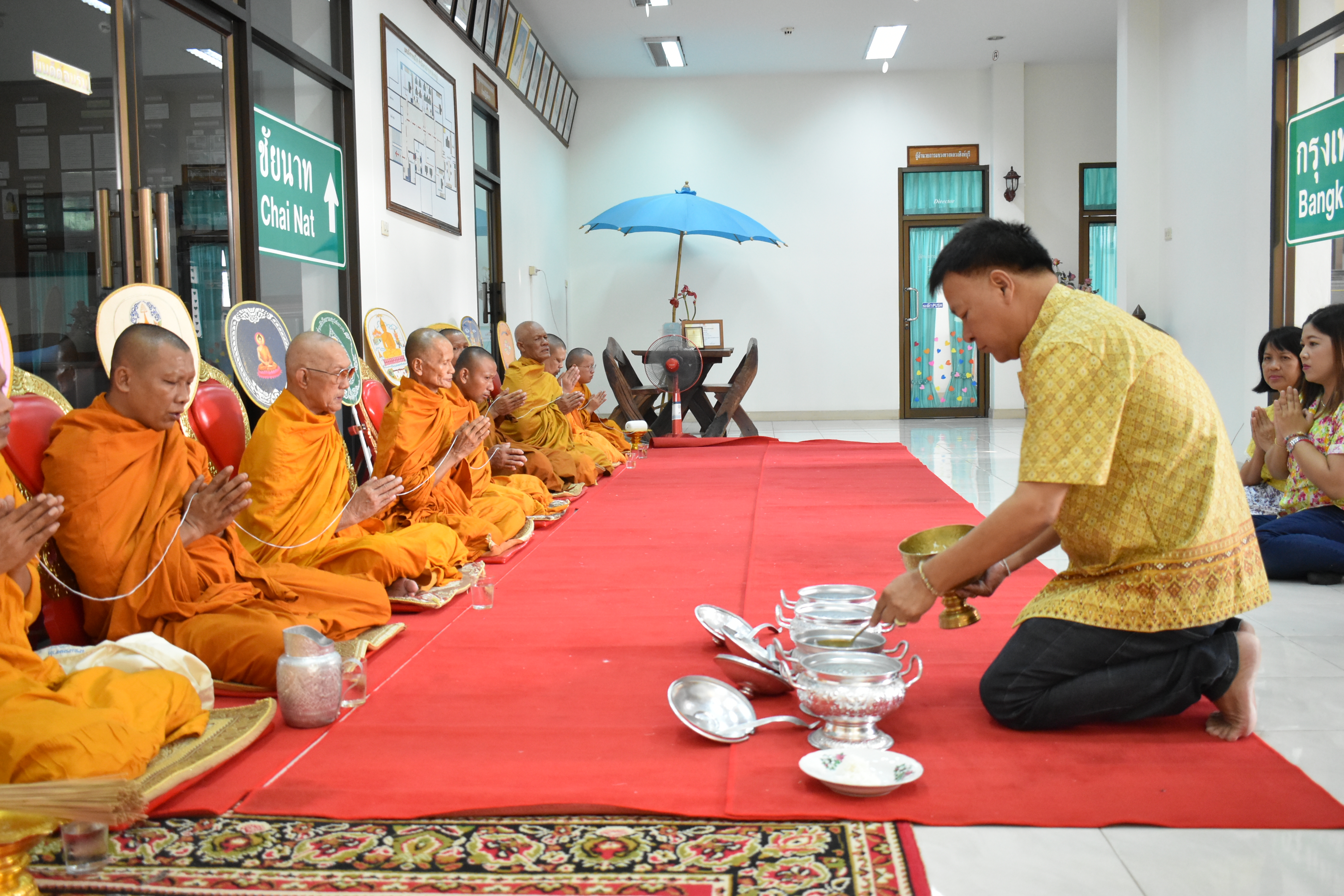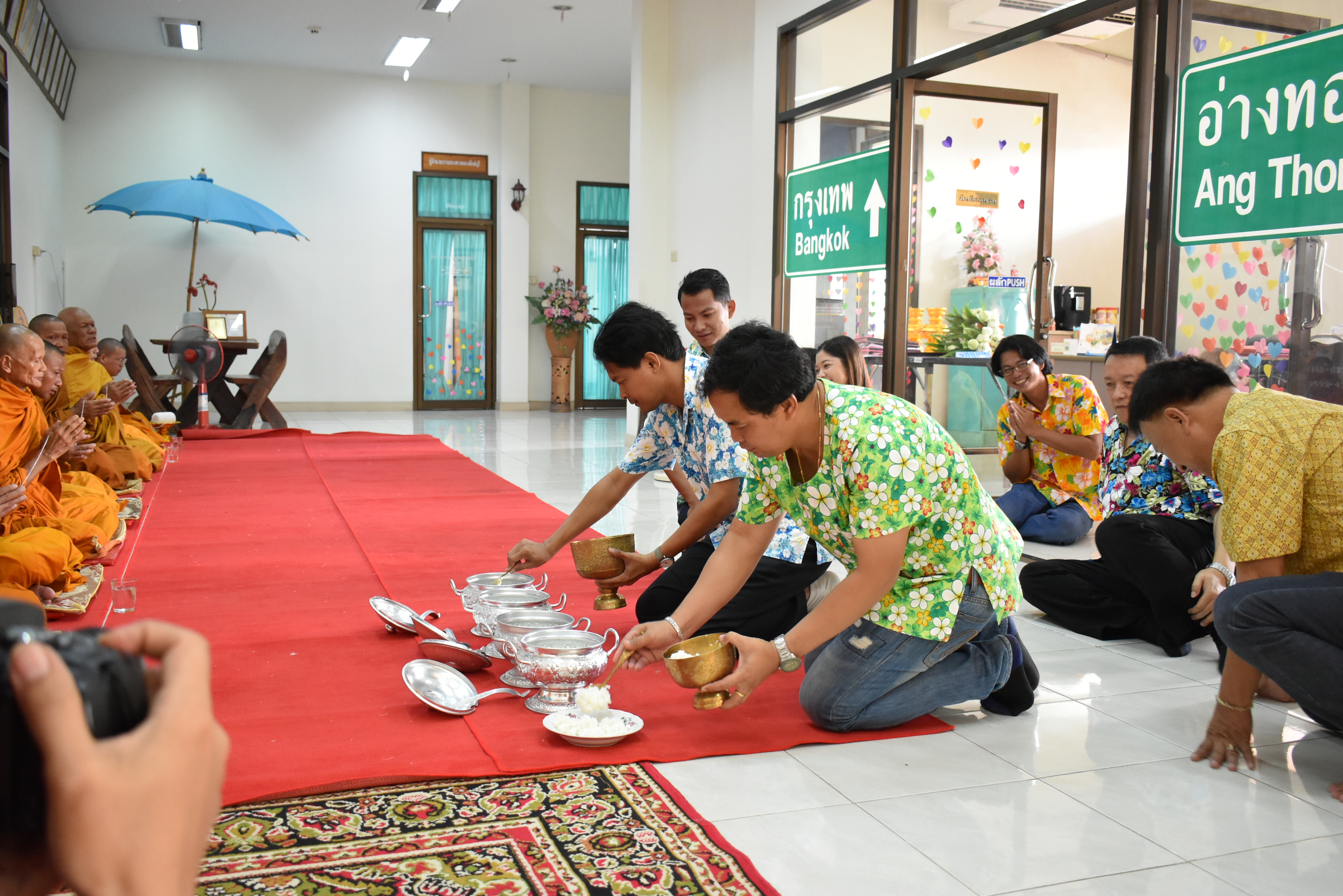 นำข้าราชการ และเจ้าหน้าที่ในสังกัด ร่วมทำบุญสงกรานต์ถวายภัตตาหารเช้าแด่พระสงฆ์ จำนวน 9 รูป