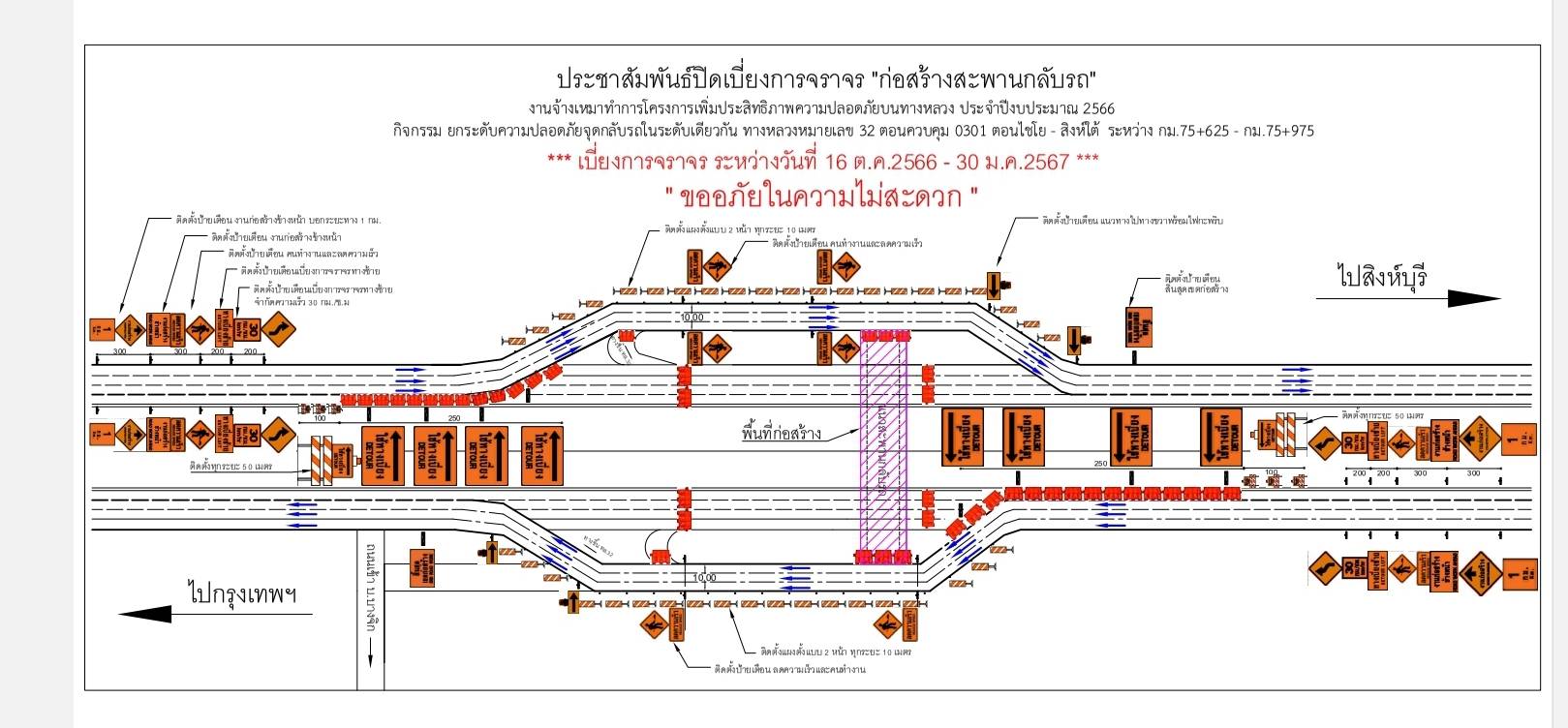 ประชาสัมพันธ์ผู้ใช้ทาง ปิดเบี่ยงการจราจร บริเวณทางหลวงหมายเลข 32 ตอนไชโย - สิงห์ใต้ กม.75+625 - กม.75+975 บริเวณดังกล่าวปิดเบี่ยงการจราจร เนื่องจากก่อสร้างสะพานกลับรถ กิจกรรมยกระดับความปลอดภัยจุดกลับรถในระดับเดียวกัน เพื่อความปลอดภัยในการเดินทาง ขอให้ขับขี่ด้วยความระมัดระวัง
