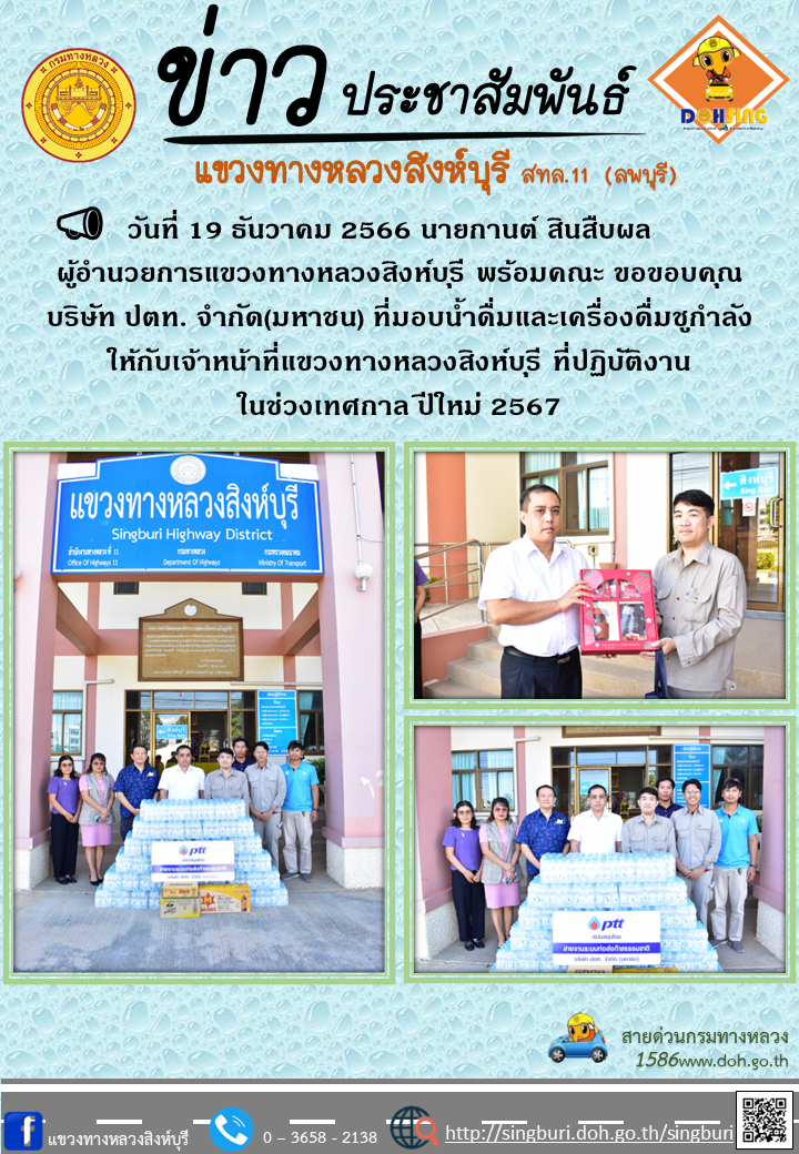 วันที่ 19 ธันวาคม 2566 นายกานต์ สินสืบผล ผู้อำนวยการแขวงทางหลวงสิงห์บุรี พร้อมคณะ ขอขอบคุณ บริษัท ปตท. จำกัด(มหาชน) ที่มอบน้ำดื่มและเครื่องดื่มชูกำลัง ให้กับเจ้าหน้าที่แขวงทางหลวงสิงห์บุรี ที่ปฏิบัติงาน ในช่วงเทศกาล ปีใหม่ 2567