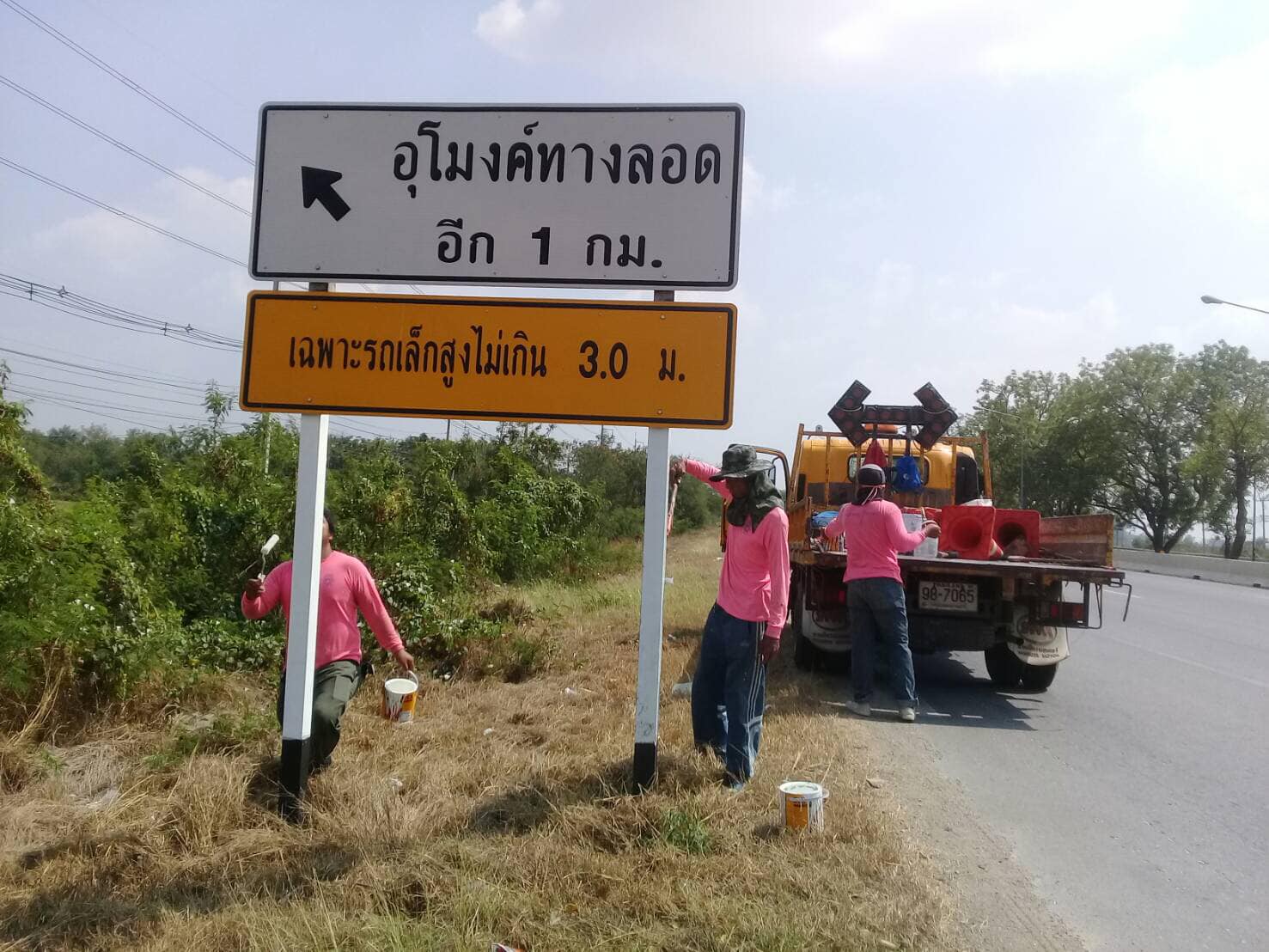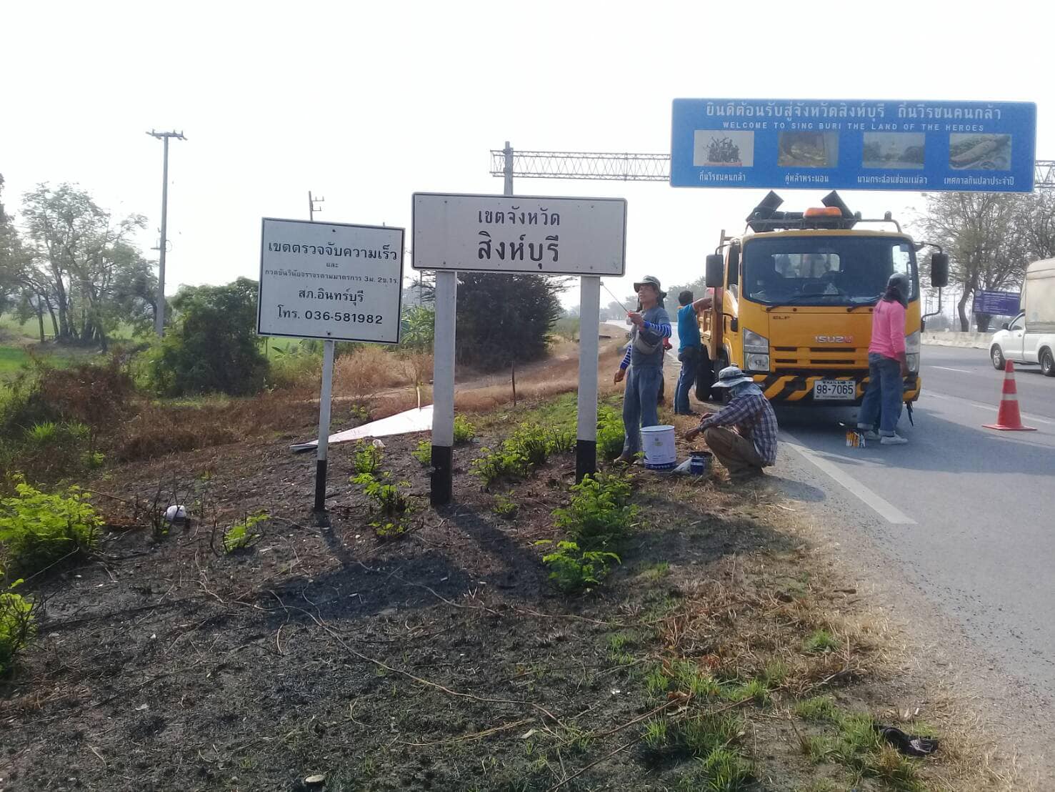 ดำเนินการทำความสะอาดและทาสีเสาป้ายจราจร บนทางหลวงหมายเลข 32