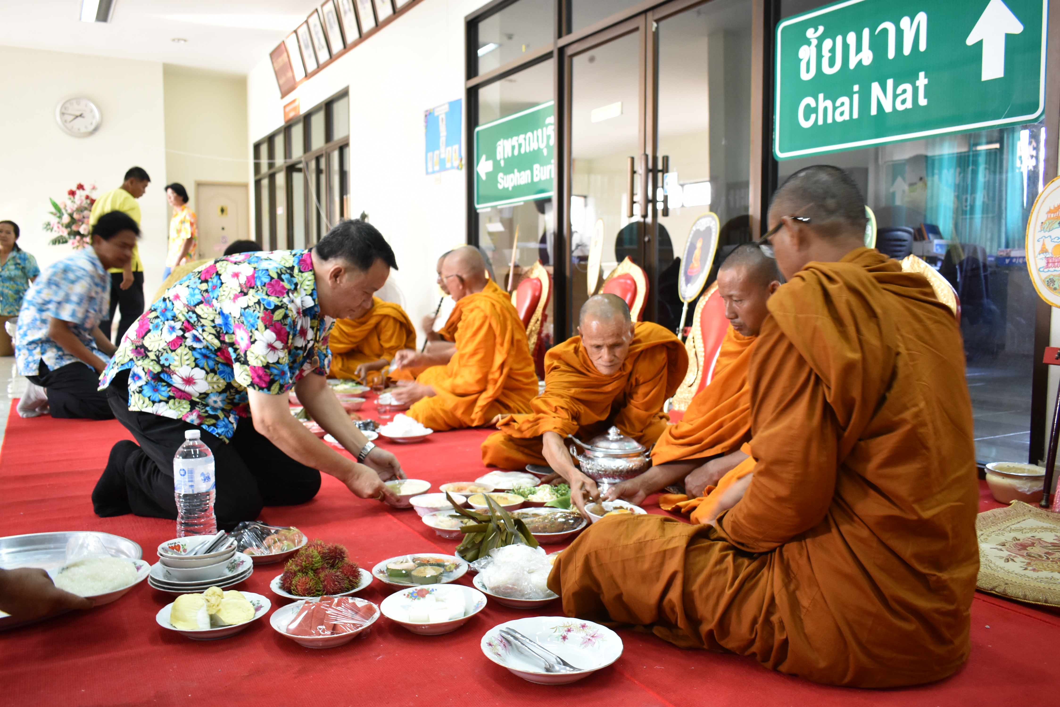 นำข้าราชการ และเจ้าหน้าที่ในสังกัด ร่วมทำบุญสงกรานต์ถวายภัตตาหารเช้าแด่พระสงฆ์ จำนวน 9 รูป